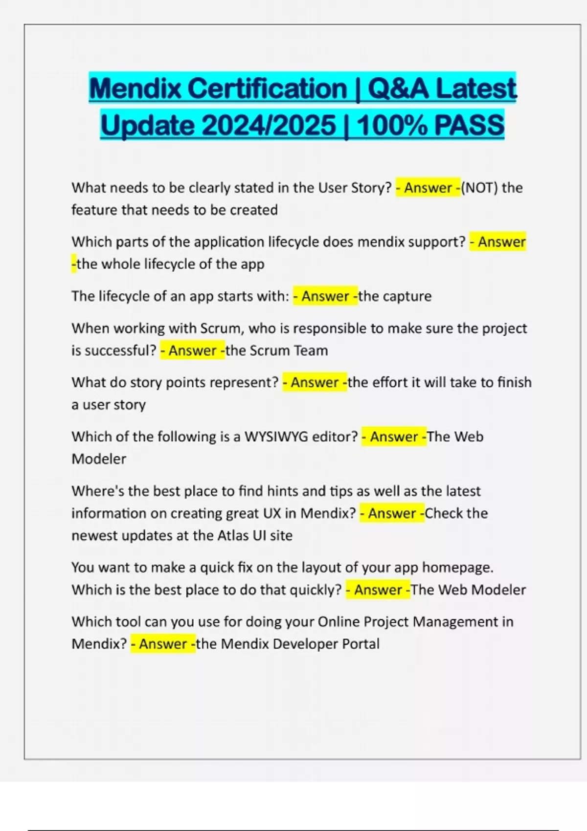 Mendix Certification | Q&A Latest Update 2024/2025 | 100% PASS What needs to be clearly stated in the User Story? - Answer -(NOT) the feature that needs to be created Which parts of the application lifecycle does mendix support? - Answer -the whole lifecycle of the app The lifecycle of an app starts with: - Answer -the capture When working with Scrum, who is responsible to make sure the project is successful? - Answer -the Scrum Team What do story points represent? - Answer -the effort it will take to finish a user story Which of the following is a WYSIWYG editor? - Answer -The Web Modeler Where's the best place to find hints and tips as well as the latest information on creating great UX in Mendix? - Answer -Check the newest updates at the Atlas UI site You want to make a quick fix on the layout of your app homepage. Which is the best place to do that quickly? - Answer -The Web Modeler Which tool can you use for doing your
