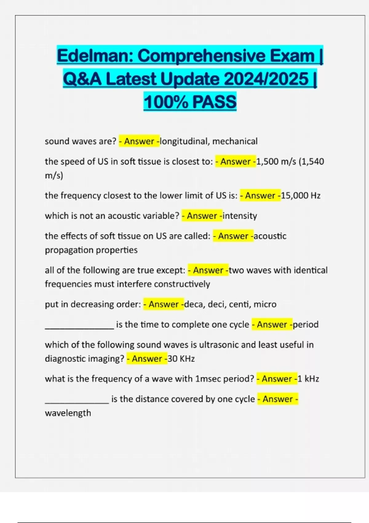Edelman: Comprehensive Exam | Q&A Latest Update 2024/2025 | 100% PASS sound waves are? - Answer -longitudinal, mechanical the speed of US in soft tissue is closest to: - Answer -1,500 m/s (1,540 m/s) the frequency closest to the lower limit of US is: - Answer -15,000 Hz which is not an acoustic variable? - Answer -intensity the effects of soft tissue on US are called: - Answer -acoustic propagation properties all of the following are true except: - Answer -two waves with identical frequencies must interfere constructively put in decreasing order: - Answer -deca, deci, centi, micro ______________ is the time to complete one cycle - Answer -period which of the following sound waves is ultrasonic and least useful in diagnostic imaging? - Answer -30 KHz what is the frequency of a wave with 1msec period? - Answer -1 kHz _____________ is the distance covered by one cycle - Answer - wavelengthWhich of the following is determined by the source and the medium? - Answer -range resolution propagation speed = ________ x wavelength - Answer -frequency as a result of ____________ the propagation speed increases - Answer - decreasing compressibility and decreasing density put in decreasing order of propagation sp