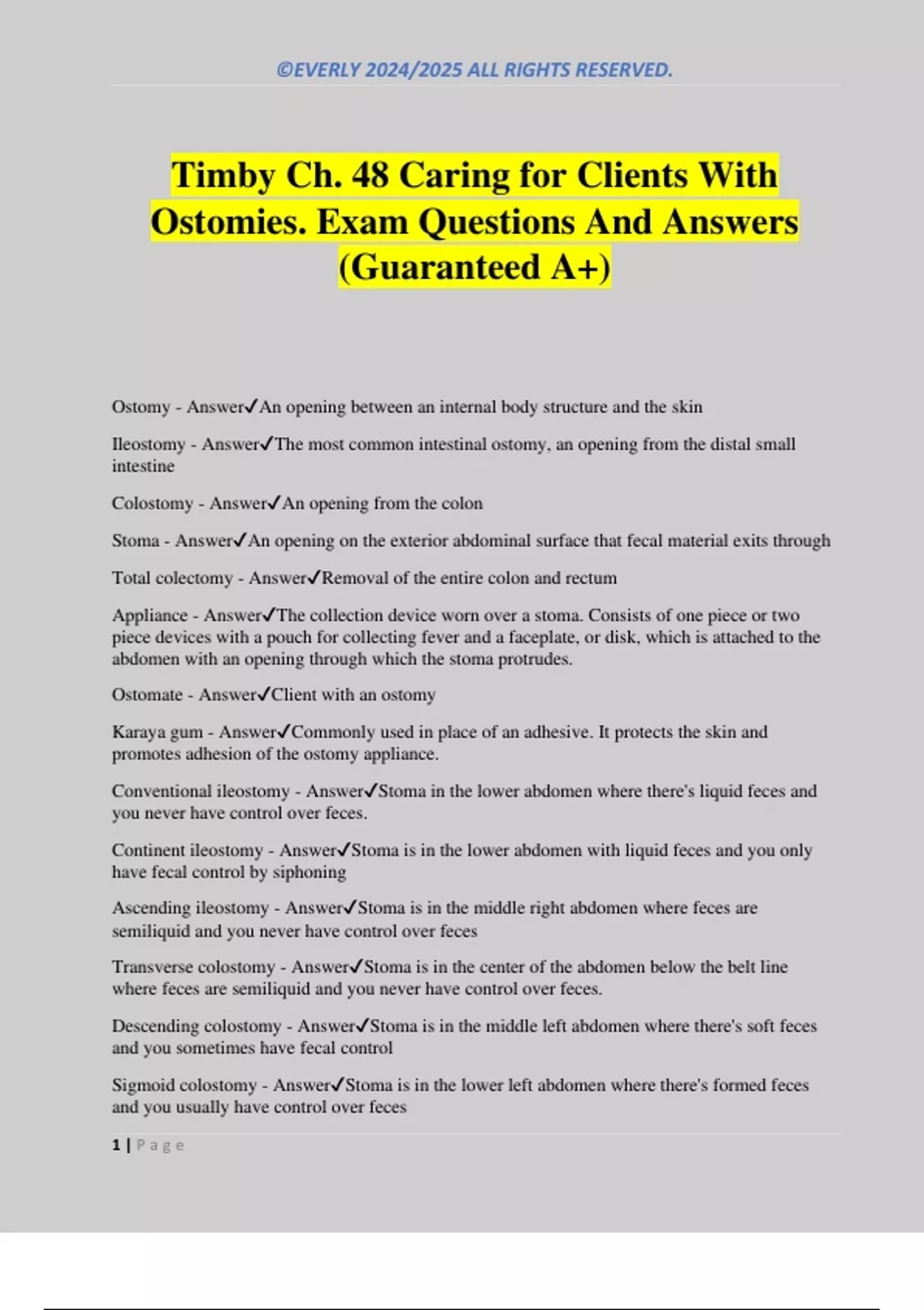 Timby Ch. 48 Caring for Clients With Ostomies. Exam Questions And Answers (Guaranteed A+)