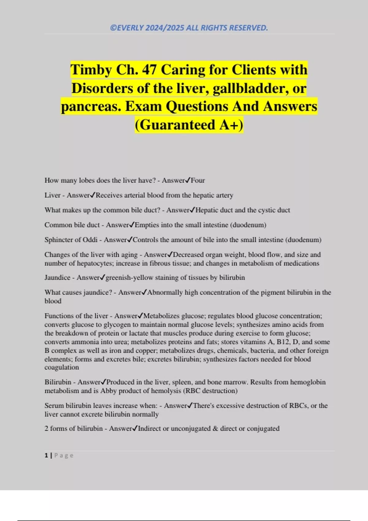 Timby Ch. 47 Caring for Clients with Disorders of the liver, gallbladder, or pancreas. Exam Questions And Answers (Guaranteed A+) How many lobes does the liver have? - AnswerFour Liver - AnswerReceives arterial blood from the hepatic artery What makes up the common bile duct? - AnswerHepatic duct and the cystic duct Common bile duct - AnswerEmpties into the small intestine (duodenum) Sphincter of Oddi - AnswerControls the amount of bile into the small intestine (duodenum) Changes of the liver with aging - AnswerDecreased organ weight, blood flow, and size and number of hepatocytes; increase in fibrous tissue; and changes in metabolism of medications Jaundice - Answergreenish-yellow staining of tissues by bilirubin What causes jaundice? - AnswerAbnormally high concentration of the pigment bilirubin in the blood Functions of the liver - AnswerMetabolizes glucose; regulates blood glucose concentration; converts glucose to glycogen to maintain normal glucose levels; synthesizes amino acids from the breakdown of protein or lactate that muscles produce during exercise to form glucose; converts ammonia into urea; metabolizes proteins and fats; stores vitamins A, B12, D, and some B complex as well as iron and copper; metabolizes drugs, chemicals, bacteria, and other foreign elements; forms and excretes bile; excretes bilirubin; synthesizes factors needed for blood coagulation Bilirubin - AnswerProduced in the liver, spleen, and bone marrow. Results from hemoglobin metabolism and is Abby product of hemolysis (RBC destruction) Serum bilirubin leaves increase when: - AnswerThere's excessive destruction of RBCs, or the liver cannot excrete bilirubin normally 2 forms of bilirubin - AnswerIndirect or unconjugated & direct or conjugated ©EVERLY 2024/2025 ALL RIGHTS RESERVED. 2 | P a g e Indirect or unconjugated bilirubin - AnswerBinds with protein as it circulates in the blood. Normally circulates in the blood when it's elevated Direct or conjugated bilirubin - AnswerCirculates freely in the blood until reaching the liver. It's excreted in the bile Test for indirect bilirubin levels - AnswerNo direct test. They're calculated by subtracting direct bilirubin levels from total bilirubin levels 3 forms of jaundince - AnswerHemolytic, hepatocellular, and obstructive Hemolytic jaundice - AnswerCaused by excess destruction of RBCs Hepatocellular jaundice - AnswerCaused by liver disease (damaged liver cells cannot clear normal amounts of bilirubin from the blood) Obstructive jaundice - AnswerCaused by a block in the passage of bile between the liver and intestinal tract Cirrhosis - AnswerChronic, degenerative liver disorder caused by generalized cellular damage What happens when bile drains into the intestine? - AnswerClient experiences malabsorption and an inability to absorb fat soluble vitamins (A, D, E, and K) Complications of advanced cirrhosis - AnswerPortal Hypertension, esophageal varices, ascites, and hepatic encephalopathy 3 types of cirrhosis - AnswerAlcoholic, postnecrotic, and biliary Alcoholic cirrhosis - AnswerMost common type of cirrhosis, results from chronic alcohol intake and is frequently associated with poor nutrition. It can also follow chronic poisoning with certain chemicals or ingestion of hepatotoxic drugs. Characterized by necrotic liver cells, which are gradually replaced by scar tissue. Postnecrotic cirrhosis - AnswerResults from destruction of liver cells secondary to infection, metabolic liver disease, or exposure to hepatotoxins or industrial chemicals Biliary cirrhosis - AnswerScarring occurs around the bile ducts in the liver. Usually related to chronic biliary obstruction and infection. Progressive autoimmune disease of the liver. Compensated cirrhosis - AnswerLess severe sign of cirrhosis. Symptoms are more vague. As the disease progresses, it's referred to as decompensated cirrhosis Signs and symptoms of decompensated cirrhosis - AnswerThey're very pronounced and indicate liver failure. Symptoms of cirrhosis - AnswerChronic fatigue, anorexia, dyspepsia, nausea, vomiting, and diarrhea or constipation, with accompanying weight loss. Many clients report clay colored or whitish stools as a result of no bile in the GI tract. May also report dark or "tea colored" urine from increased concentrations of urobil