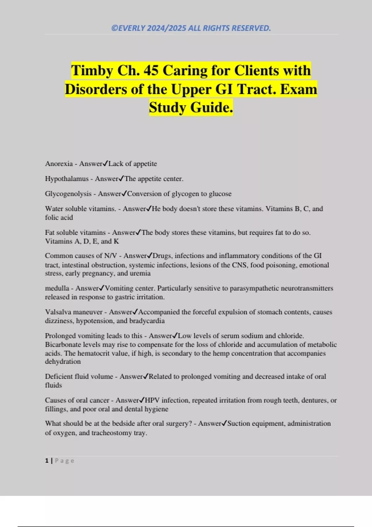 Timby Ch. 45 Caring for Clients with Disorders of the Upper GI Tract. Exam Study Guide. Anorexia - AnswerLack of appetite Hypothalamus - AnswerThe appetite center. Glycogenolysis - AnswerConversion of glycogen to glucose Water soluble vitamins. - AnswerHe body doesn't store these vitamins. Vitamins B, C, and folic acid Fat soluble vitamins - AnswerThe body stores these vitamins, but requires fat to do so. Vitamins A, D, E, and K Common causes of N/V - AnswerDrugs, infections and inflammatory conditions of the GI tract, intestinal obstruction, systemic infections, lesions of the CNS, food poisoning, emotional stress, early pregnancy, and uremia medulla - AnswerVomiting center. Particularly sensitive to parasympathetic neurotransmitters released in response to gastric irritation. Valsalva maneuver - AnswerAccompanied the forceful expulsion of stomach contents, causes dizziness, hypotension, and bradycardia Prolonged vomiting leads to this - AnswerLow levels of serum sodium and chloride. Bicarbonate levels may rise to compensate for the loss of chloride and accumulation of metabolic acids. The hematocrit value, if high, is secondary to the hemp concentration that accompanies dehydration Deficient fluid volume - AnswerRelated to prolonged vomiting and decreased intake of oral fluids Causes of oral cancer - AnswerHPV infection, repeated irritation from rough teeth, dentures, or fillings, and poor oral and dental hygiene What should be at the bedside after oral surgery? - AnswerSuction equipment, administration of oxygen, and tracheostomy tray.
