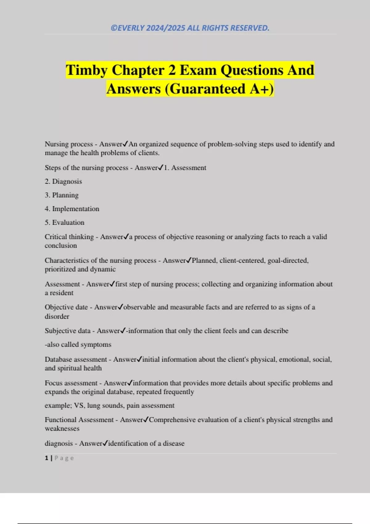 Timby Chapter 2 Exam Questions And Answers (Guaranteed A+) Nursing process - AnswerAn organized sequence of problem-solving steps used to identify and manage the health problems of clients. Steps of the nursing process - Answer1. Assessment 2. Diagnosis 3. Planning 4. Implementation 5. Evaluation Critical thinking - Answera process of objective reasoning or analyzing facts to reach a valid conclusion Characteristics of the nursing process - AnswerPlanned, client-centered, goal-directed, prioritized and dynamic Assessment - Answerfirst step of nursing process; collecting and organizing information about a resident Objective date - Answerobservable and measurable facts and are referred to as signs of a disorder Subjective data - Answer-information that only the client feels and can describe -also called symptoms Database assessment - Answerinitial information about the client's physical, emotional, social, and spiritual health Focus assessment - Answerinformation that provides more details about specific problems and expands the original database, repeated frequently example; VS, lung sounds, pain assessment Functional Assessment - AnswerComprehensive evaluation of a client's physical strengths and weaknesses diagnosis - Answeridentification