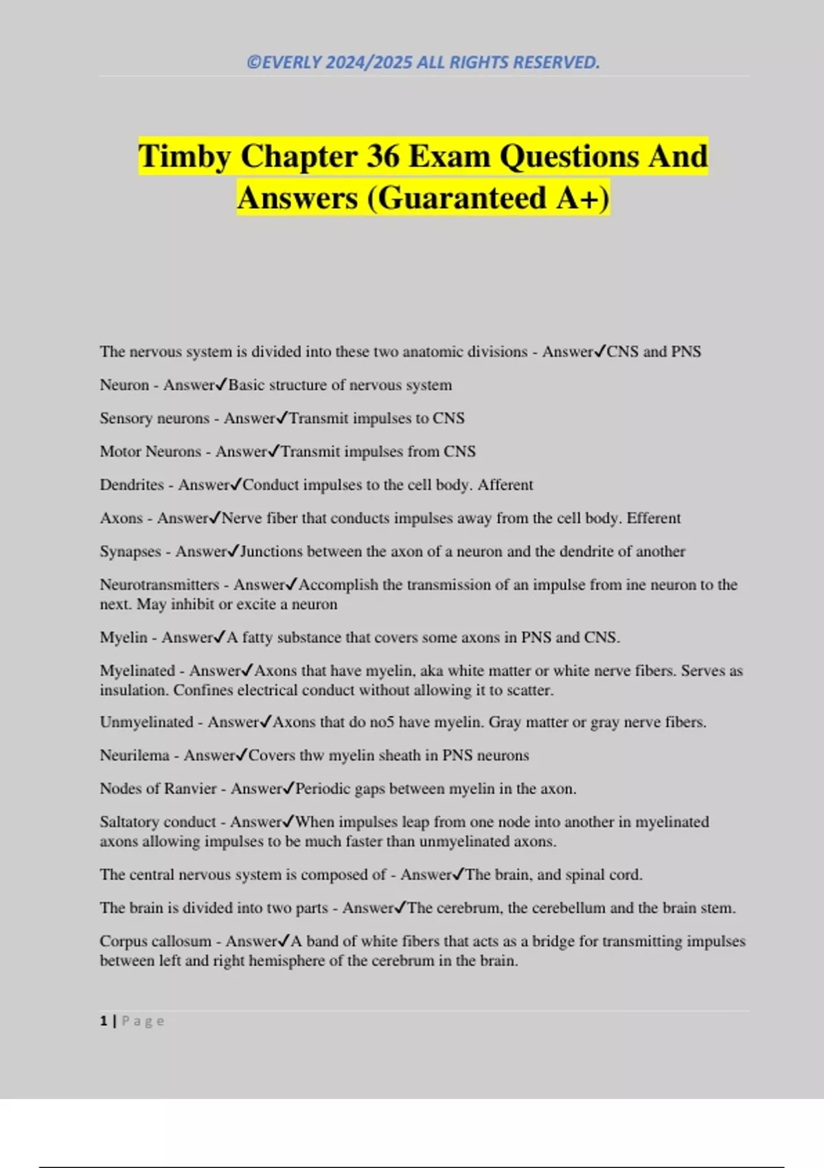 Timby Chapter 36 Exam Questions And Answers (Guaranteed A+) The nervous system is divided into these two anatomic divisions - AnswerCNS and PNS Neuron - AnswerBasic structure of nervous system Sensory neurons - AnswerTransmit impulses to CNS Motor Neurons - AnswerTransmit impulses from CNS Dendrites - AnswerConduct impulses to the cell body. Afferent Axons - AnswerNerve fiber that conducts impulses away from the cell body. Efferent Synapses - AnswerJunctions between the axon of a neuron and the dendrite of another Neurotransmitters - AnswerAccomplish the transmission of an impulse from ine neuron to the next. May inhibit or excite a neuron Myelin - AnswerA fatty substance that covers some axons in PNS and CNS. Myelinated - AnswerAxons that have myelin, aka white matter or white nerve fibers. Serves as insulation. Confines electrical conduct without allowing it to scatter. Unmyelinated - AnswerAxons that do no5 have myelin. Gray matter or gray nerve fibers. Neurilema - AnswerCovers thw myelin sheath in PNS neurons Nodes of Ranvier - AnswerPeriodic gaps between myelin in the axon. Saltatory conduct - AnswerWhen impulses leap from one node into another in myelinated axons allowing impulses to be much faster than unmyelinated axons. The central nervous system is composed of - AnswerThe brain, and spinal cord. The brain is divided into two parts - AnswerThe cerebrum, the cerebellum and the brain stem. Corpus callosum - AnswerA band of white fibers that acts as a bridge for transmitting impulses between left and right hemisphere of the cerebrum in the brain.