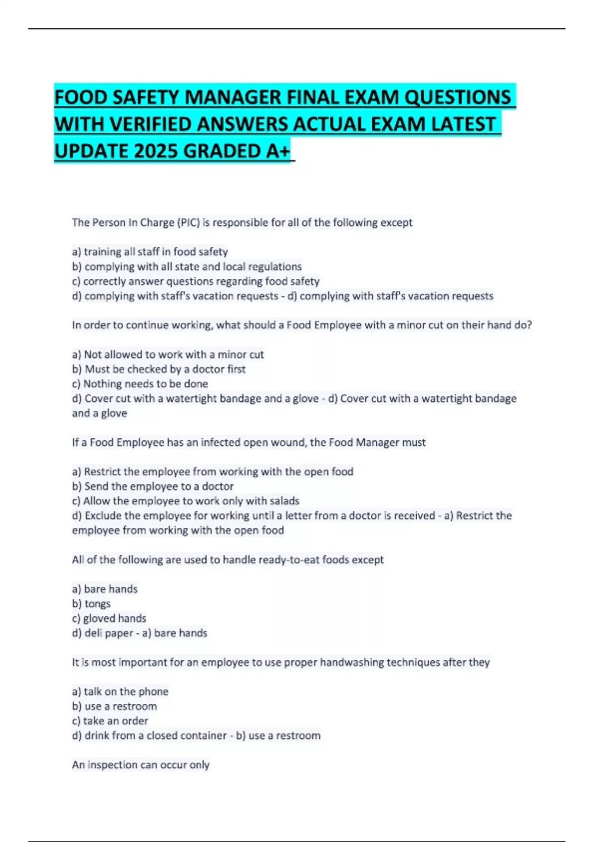 FOOD SAFETY MANAGER FINAL EXAM QUESTIONS WITH VERIFIED ANSWERS ACTUAL EXAM LATEST UPDATE 2025 GRADED A+