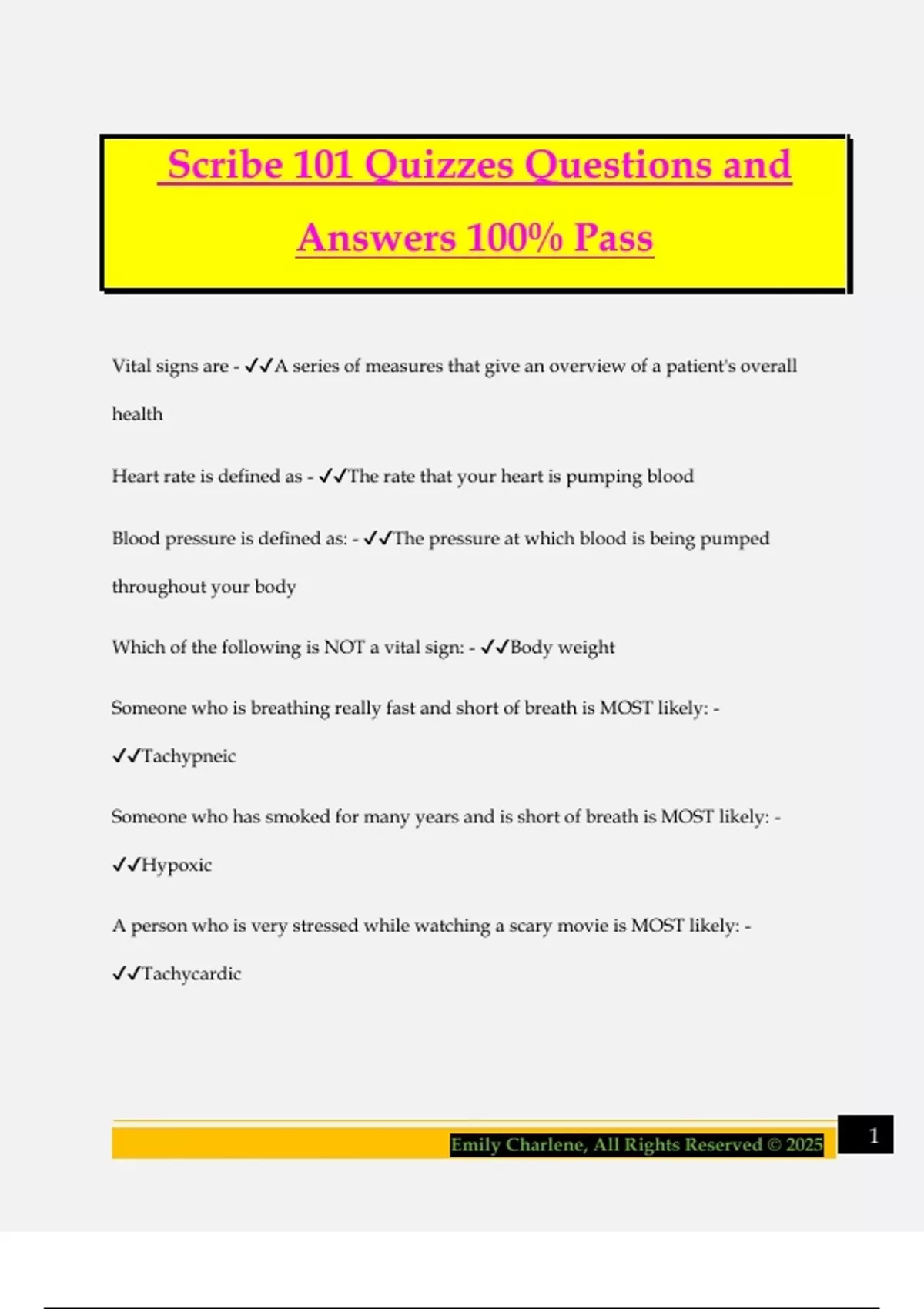 Scribe 101 Quizzes Questions and Answers 100% Pass Vital signs are - A series of measures that give an overview of a patient's overall health Heart rate is defined as - The rate that your heart is pumping blood Blood pressure is defined as: - The pressure at which blood is being pumped throughout your body Which of the following is NOT a vital sign: - Body weight Someone who is breathing really fast and short of breath is MOST likely: - Tachypneic Someone who has smoked for many years and is short of breath is MOST likely: - Hypoxic A person who is very stressed while watching a scary movie is MOST likely: - Tachycardic 2Emily Charlene, All Rights Reserved © 2025 A sick child who has had a fever for 2 hours most likely has which temperature? - 102.5 Oxygen saturation is defined as: - The saturation of oxygen in your blood Vital signs are usually measured in rate of how many times a second is it happening - False "I'm having severe chest pain and shortness of breath." - Emergency Department "I've had a sore and scratchy throat for a few days." - Urgent Care "I'm here for a regular check up for my diabetes." - Outpatient Clinic A 92 year old male presented to the ED without a heart rate and not breathing. He was successfully resuscitated in the Emergency Department, but he required a breathing tube (intubation) and is receiving oxygen through a ventil