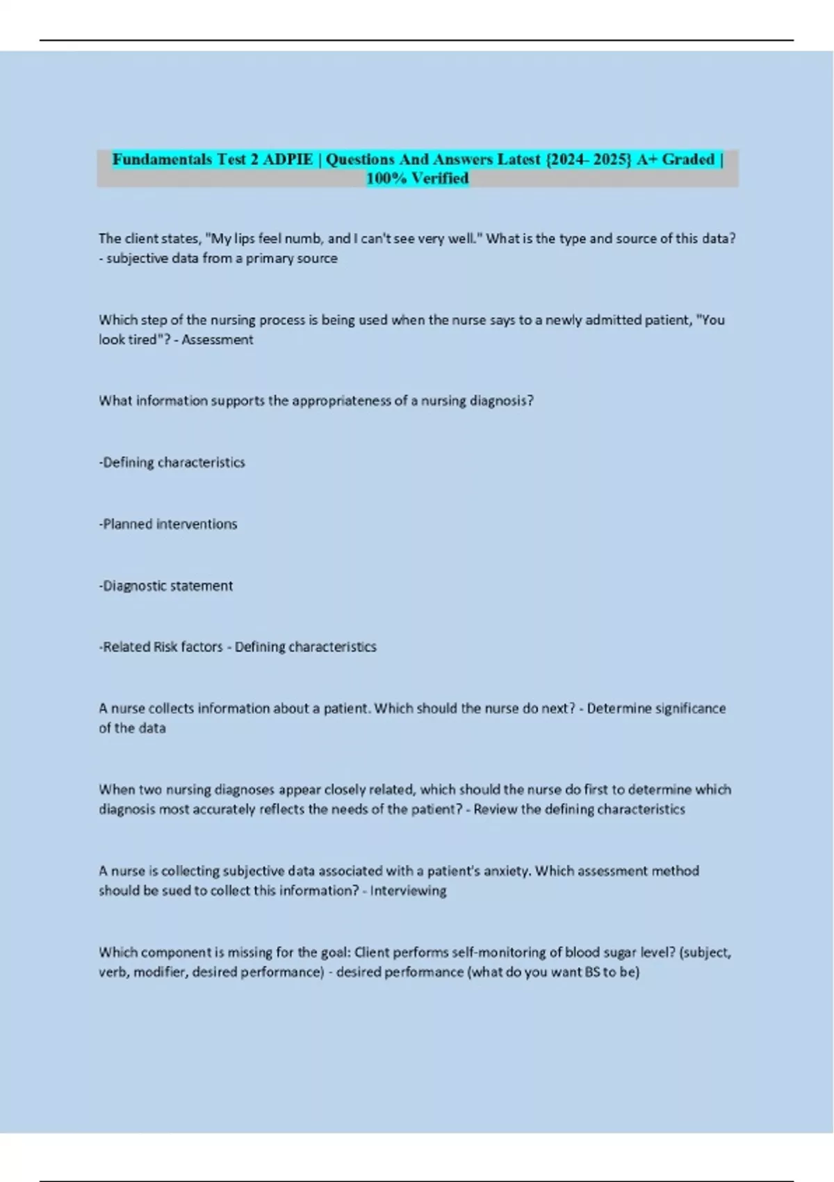 Fundamentals Test 2 ADPIE | Questions And Answers
