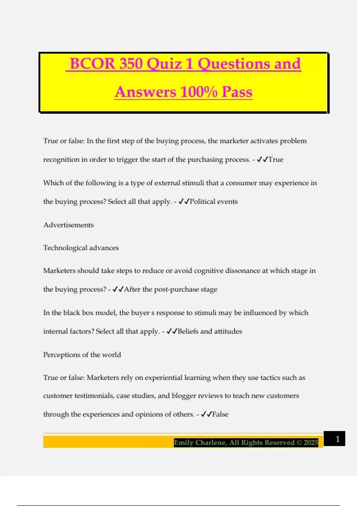 BCOR 350 Quiz 1 Questions and Answers 100% Pass True or false: In the first step of the buying process, the marketer activates problem recognition in order to trigger the start of the purchasing process. - True Which of the following is a type of external stimuli that a consumer may experience in the buying process? Select all that apply. - Political events Advertisements Technological advances Marketers should take steps to reduce or avoid cognitive dissonance at which stage in the buying process? - After the post-purchase stage In the black box model, the buyer s response to stimuli may be influenced by which internal factors? Select all that apply. - Beliefs and attitudes Perceptions of the world True or false: Marketers rely on experiential learning when they use tactics such as customer testimonials, case studies, and blogger reviews to teach new customers through the experiences and opinions of others. - False 2Emily Charlene, All Rights Reserved © 2025 Implementation includes which of the following? Select all that apply. - Getting the product to the consumer Determining where to promote the product Setting a commission rate for the salespeople True or false: When determining a budget for a marketing campaign, the marketing team s first consideration should be how much its competitors are spending on marketing - False Which of the following are true about a buyer persona? Select all that apply. - A good persona is based on market research. It involves a fictional and generalized person. It includes a name and a story at its most basic. What is the underlying reason that most small businesses fail? - Failure to plan sufficiently Like military strategy, business strategy includes a degree of _____, which makes it more challenging to achieve desired results. - uncertainty