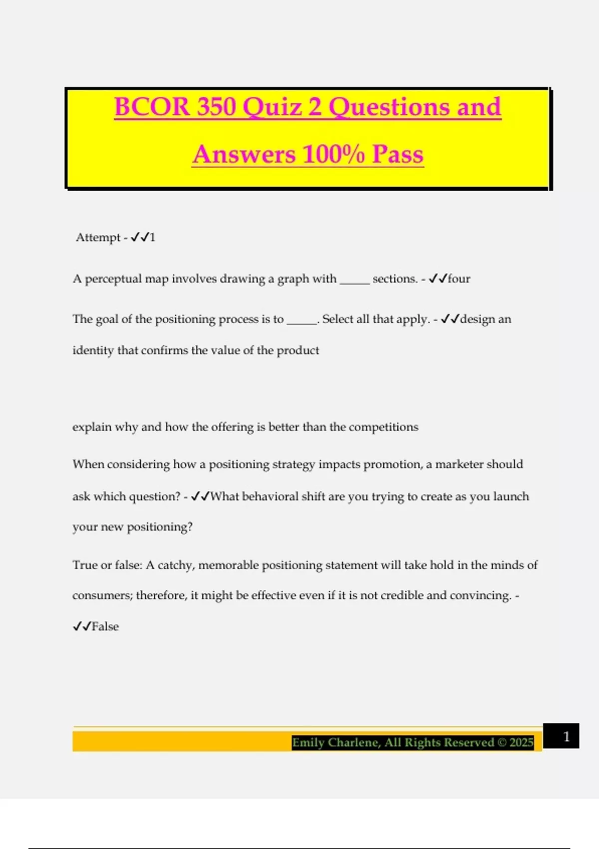 BCOR 350 Quiz 2 Questions and Answers 100% Pass Attempt - 1 A perceptual map involves drawing a graph with _____ sections. - four The goal of the positioning process is to _____. Select all that apply. - design an identity that confirms the value of the product explain why and how the offering is better than the competitions When considering how a positioning strategy impacts promotion, a marketer should ask which question? - What behavioral shift are you trying to create as you launch your new positioning? True or false: A catchy, memorable positioning statement will take hold in the minds of consumers; therefore, it might be effective even if it is not credible and convincing. - False 2Emily Charlene, All Rights Reserved © 2025 True or false: Repositioning has the potential to undermine or weaken market perceptions, as well as offer the opportunity to make something new and better. - True Which of the following is an advantage of using secondary sources for marketing research? Select all that apply. - They are considerably less expensive than using primary data. Collecting data from them takes less time than collecting primary data. True or false: Primary research analyzes information that has already been collected for another purpose by a third party, such as a government agency, an industry association, or another company. - False True or false: It is a good idea for marketers to keep up with their competitors by reading competitors company websites, following them on social media, and monitoring press releases and other published content. - True