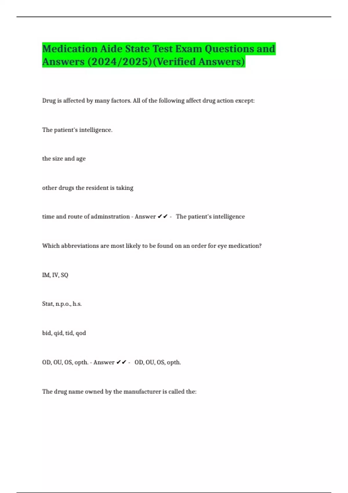 Medication Aide State Test Exam Questions and