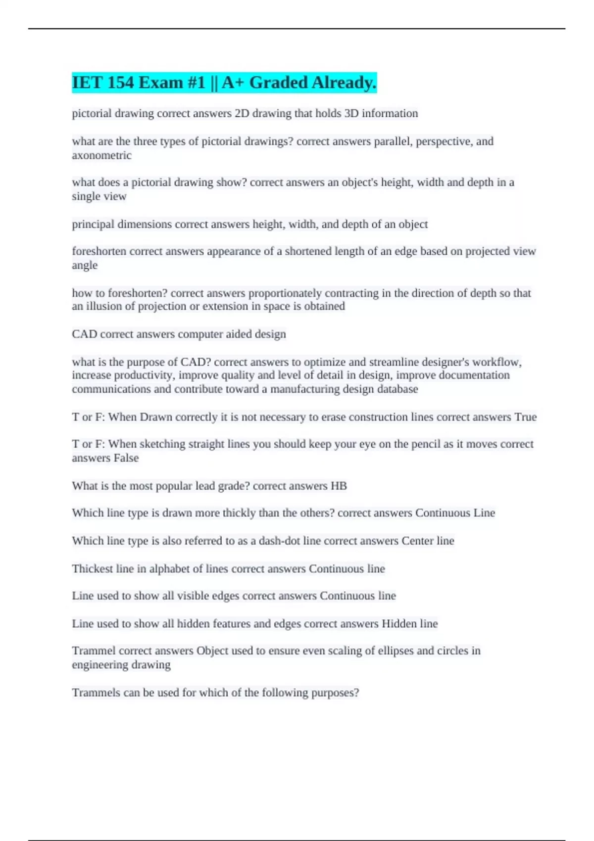 pictorial drawing correct answers 2D drawing that holds 3D information what are the three types of pictorial drawings? correct answers parallel, perspective, and axonometric what does a pictorial drawing show? correct answers an object's height, width and depth in a single view principal dimensions correct answers height, width, and depth of an object foreshorten correct answers appearance of a shortened length of an edge based on projected view angle how to foreshorten? correct answers proportionately contracting in the direction of depth so that an illusion of projection or extension in space is obtained CAD correct answers computer aided design what is the purpose of CAD? correct answers to optimize and streamline designer's workflow, increase productivity, improve quality and level of detail in design, improve documentation communications and contribute toward a manufacturing design database T or F: When Drawn correctly it is not necessary to erase construction lines correct answers True T or F: When sketching straight lines you should keep your eye on the pencil as it moves correct answers False What is the most popular lead grade? correct answers HB Which line type is drawn more thickly than the others? correct answers Continuous Line Which line type is also referred to as a dash-dot line correct answers Center line Thickest line in alphabet of lines correct answers Continuous line Line used to show all visible edges correct answers Continuous line Line used to show all hidden features and edges correct answers Hidden line Trammel correct answers Object used to ensure even scaling of ellipses and circles in engineering drawing Trammels can be used for which of the following purposes?