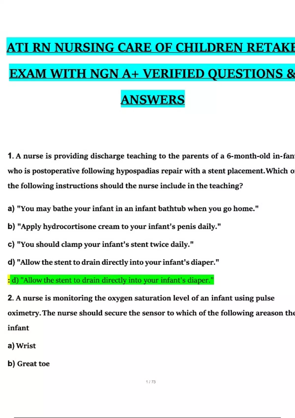 ATI RN NURSING CARE OF CHILDREN RETAKE EXAM WITH A+ VERIFIED QUESTIONS & ANSWERS ( V5 )