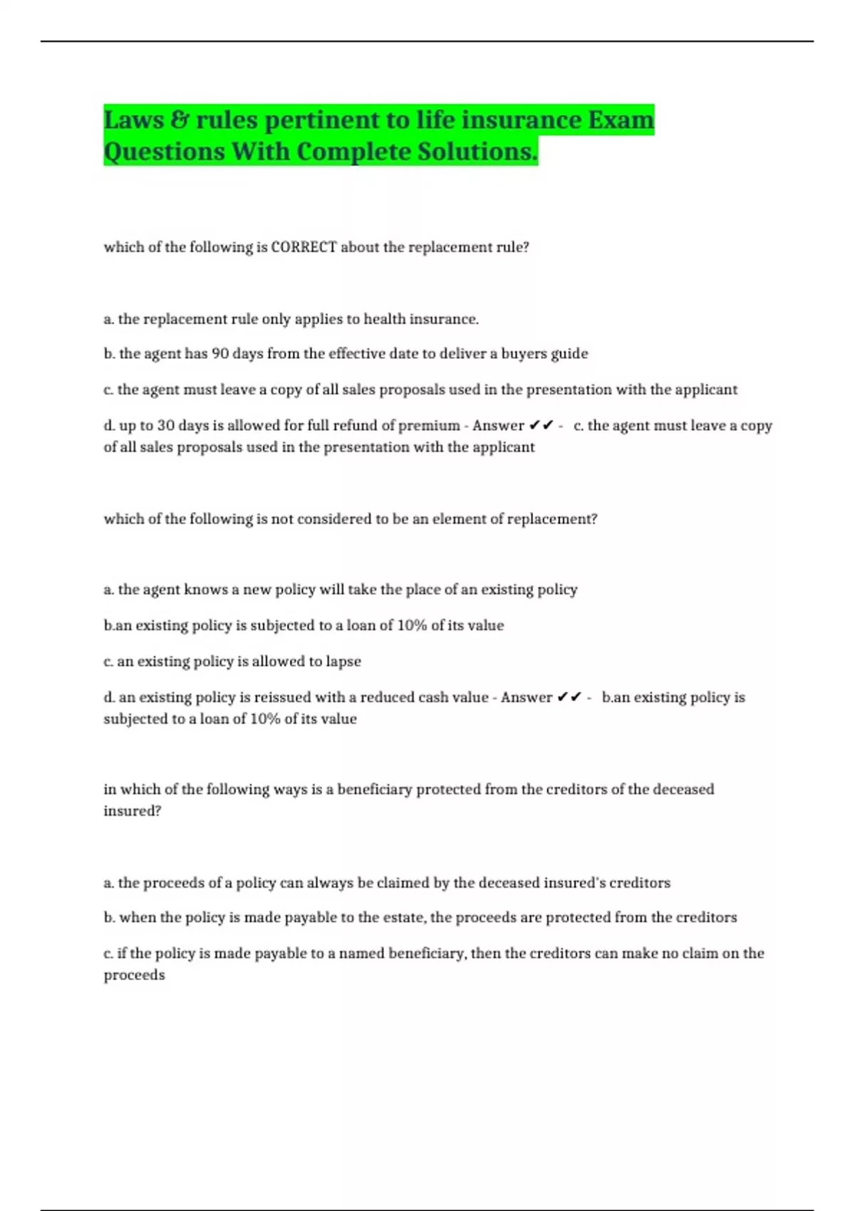 Answer ✔✔ - c. if the policy is made payable to a named beneficiary, then the creditors can make