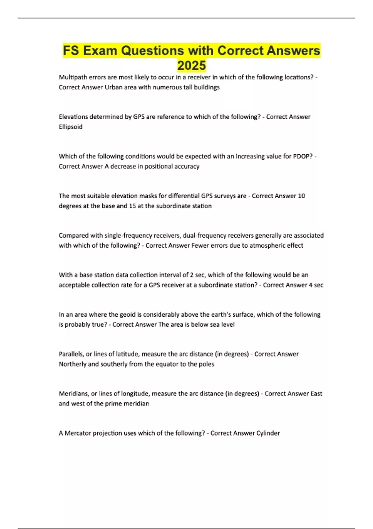FS Exam Questions with Correct Answers 2025 Multipath errors are most likely to occur in a receiver in which of the following locations? - Correct Answer Urban area with numerous tall buildings Elevations determined by GPS are reference to which of the following? - Correct Answer Ellipsoid Which of the following conditions would be expected with an increasing value for PDOP? - Correct Answer A decrease in positional accuracy The most suitable elevation masks for differential GPS surveys are - Correct Answer 10 degrees at the base and 15 at the subordinate station Compared with single-frequency receivers, dual-frequency receivers generally are associated with which of the following? - Correct Answer Fewer errors due to atmospheric effect With a base station data collection interval of 2 sec, which of the following would be an acceptable collection rate for a GPS receiver at a subordinate station? - Correct Answer 4 sec In an area where the geoid is considerably above the earth's surface, which of the following is probably true? - Correct Answer The area is below sea level Parallels, or lines of latitude, measure the arc distance (in degrees) - Correct Answer Northerly and southerly from the equator to the poles Meridians, or lines of longitude, measure the arc distance (in degrees) - Correct Answer East and west of the prime meridian A Mercator projection uses which of the following? - Correct Answer Cylinder A Lambert projection uses which of the following? - Correct Answer Cone