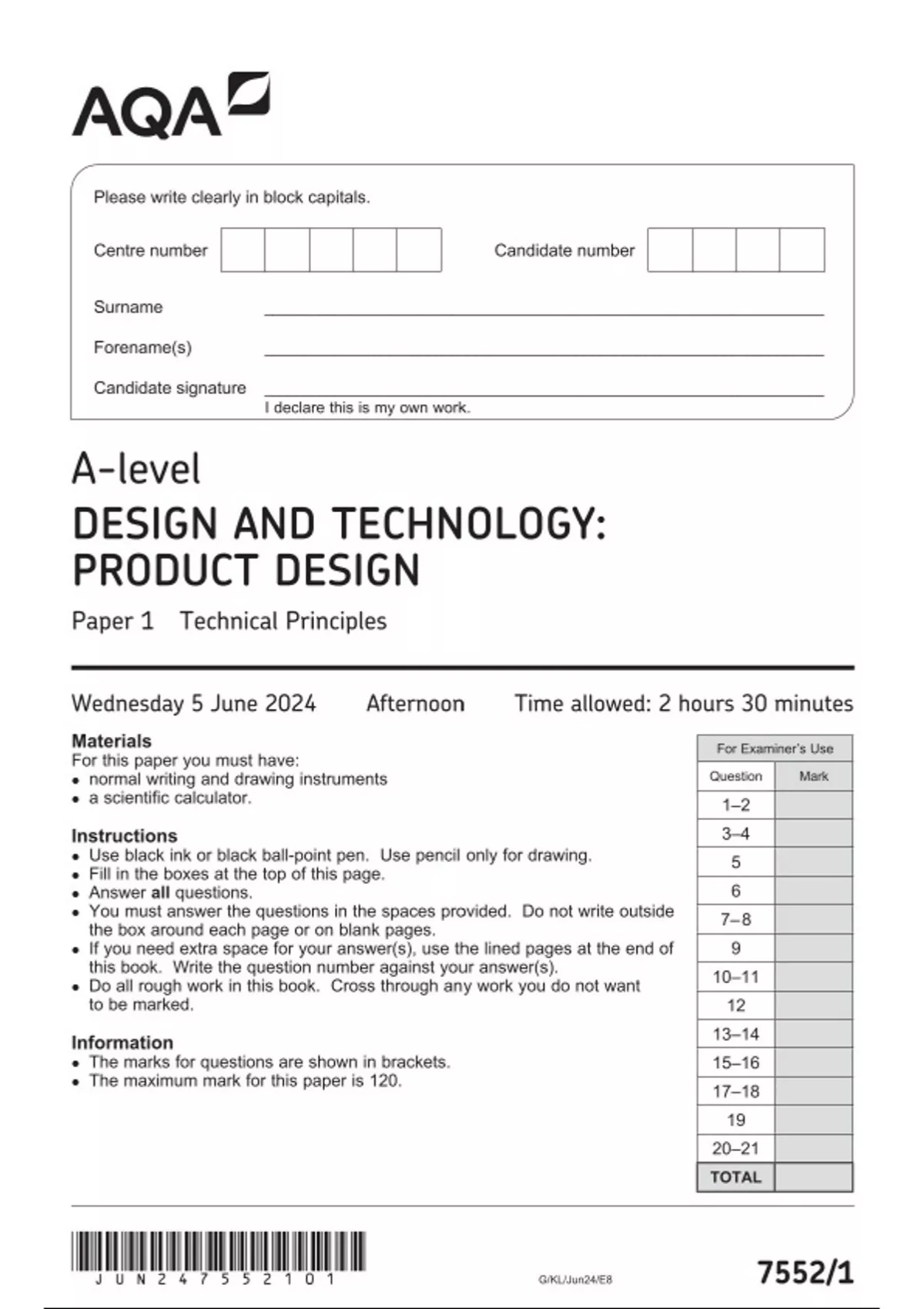 AQA A-level DESIGN AND TECHNOLOGY: PRODUCT DESIGN Paper 1 JUNE 2024 QUESTION PAPER: Technical Principles