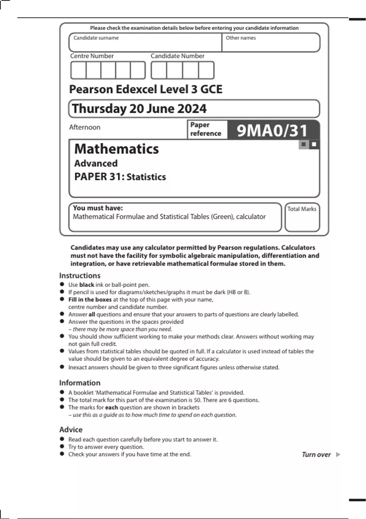 •• A booklet ‘Mathematical Formulae and Statistical Tables’ is provided.