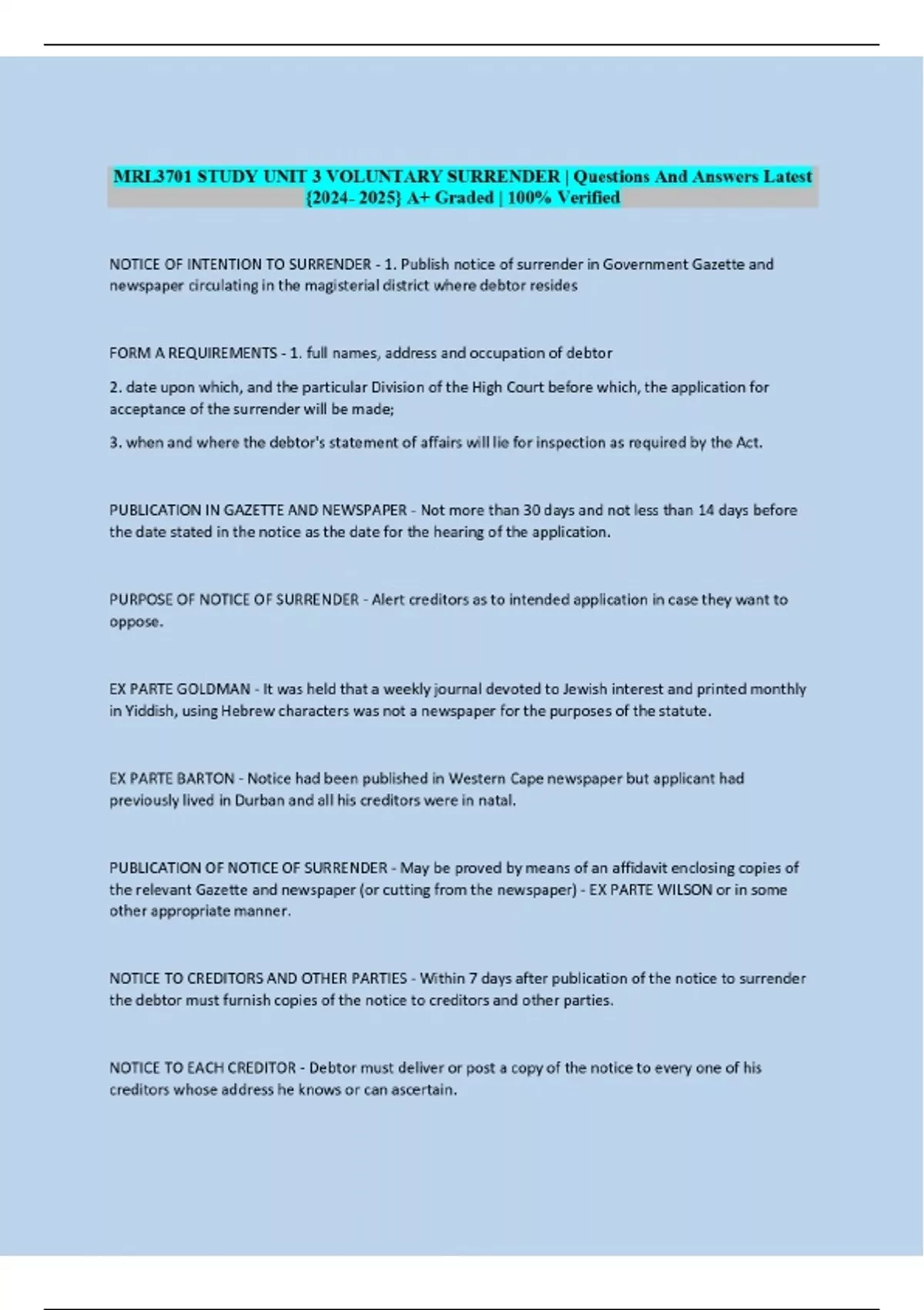 MRL3701 STUDY UNIT 3 VOLUNTARY SURRENDER | Questions And Answers