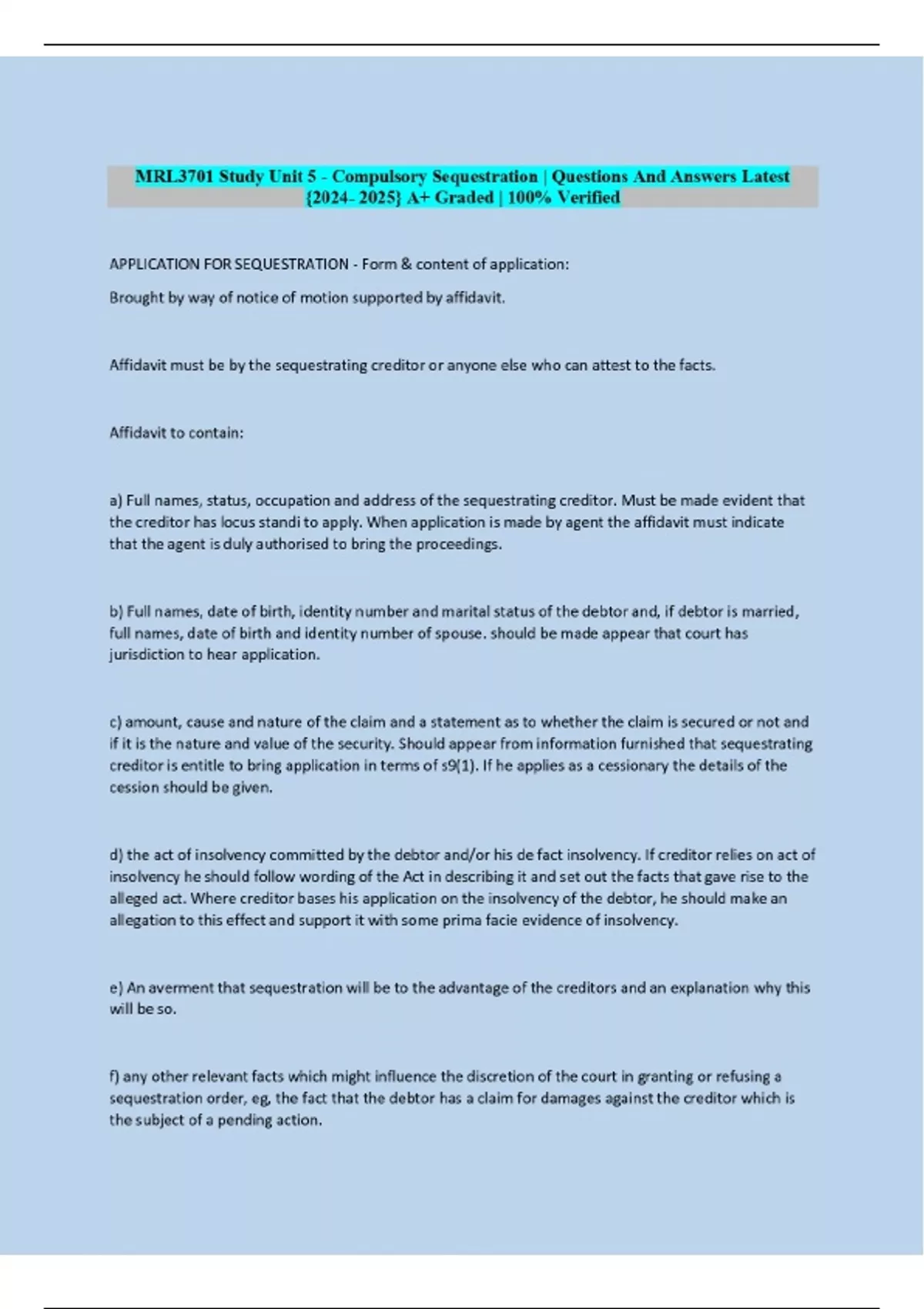 MRL3701 Study Unit 5 - Compulsory Sequestration | Questions And Answers