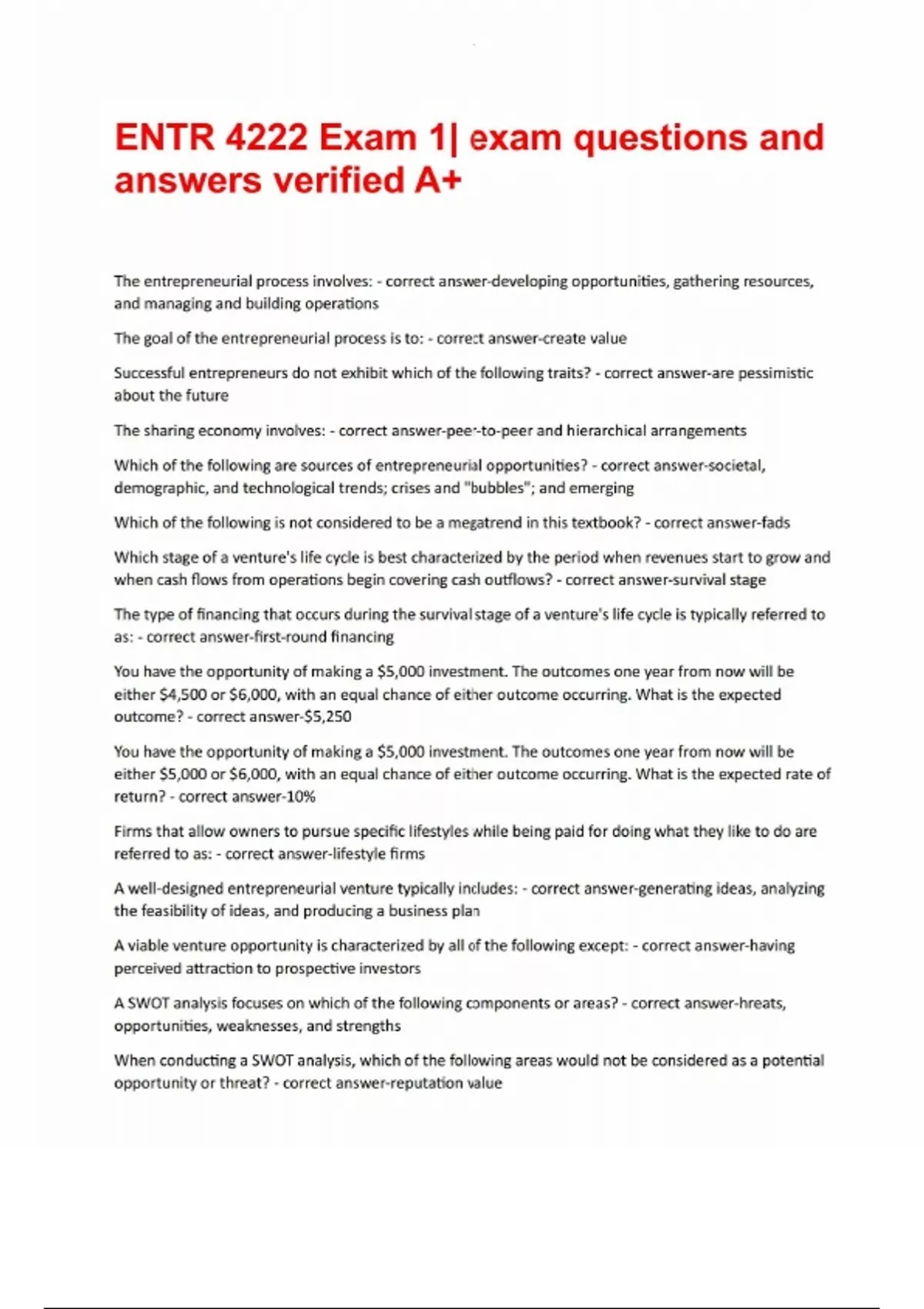 ENTR 4222 Exam 1 exam questions and answers verified A+ENTR 4222 Exam 1 exam questions and answers verified A+ENTR 4222 Exam 1 exam questions and answers verified A+ENTR 4222 Exam 1 exam questions and answers verified A+ENTR 4222 Exam 1 exam questions and answers verified A+ENTR 4222 Exam 1 exam questions and answers verified A+
