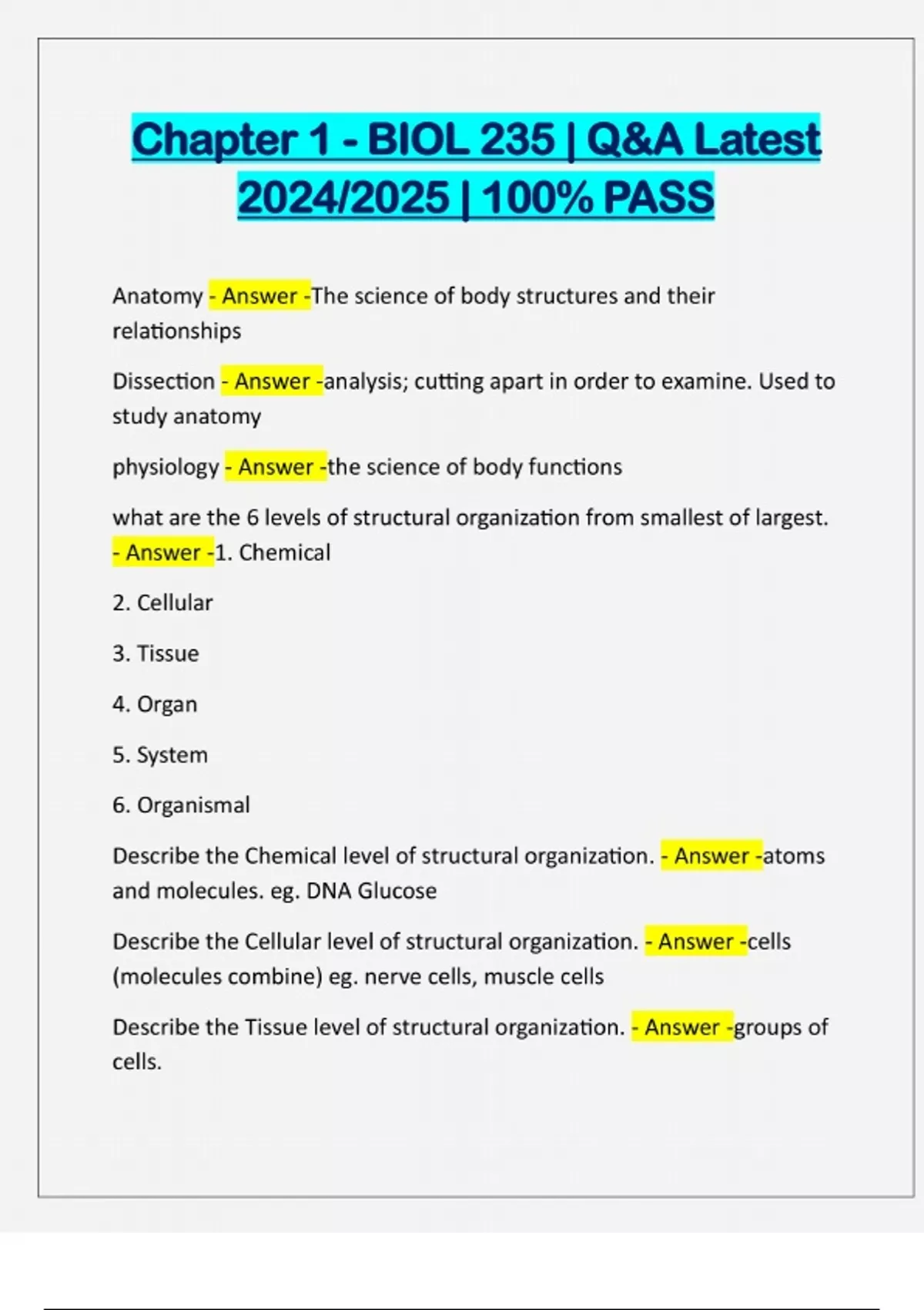 Chapter 1 - BIOL 235 | Q&A Latest 2024/2025 | 100% PASS Anatomy - Answer -The science of body structures and their relationships Dissection - Answer -analysis; cutting apart in order to examine. Used to study anatomy physiology - Answer -the science of body functions what are the 6 levels of structural organization from smallest of largest. - Answer -1. Chemical 2. Cellular 3. Tissue 4. Organ 5. System 6. Organismal Describe the Chemical level of structural organization. - Answer -atoms and molecules. eg. DNA Glucose Describe the Cellular level of structural organization. - Answer -cells (molecules combine) eg. nerve cells, muscle cells Describe the Tissue level of structural organization. - Answer -groups of cells.Describe the organ level of structural organization. - Answer -tissues join together Describe the system level of structural organization. - Answer -related organs Describe the organismal level of structural organization. - Answer -any living individual what are the 4 types of tissue? - Answer -1. epithelial - body surface, lines hollow organs and cavities 2. connective - connects, supports, prote