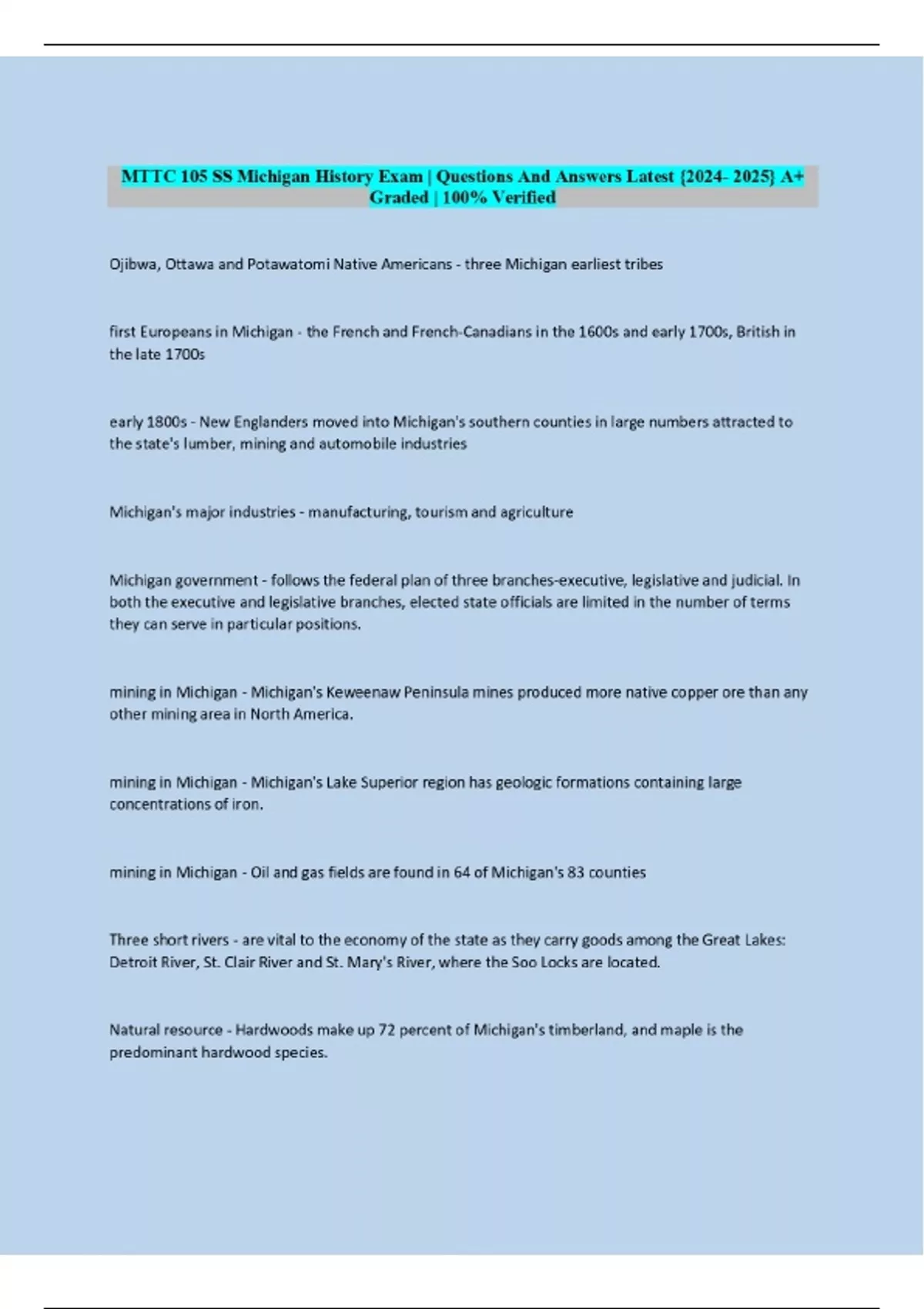 MTTC 105 SS Michigan History Exam | Questions And Answers