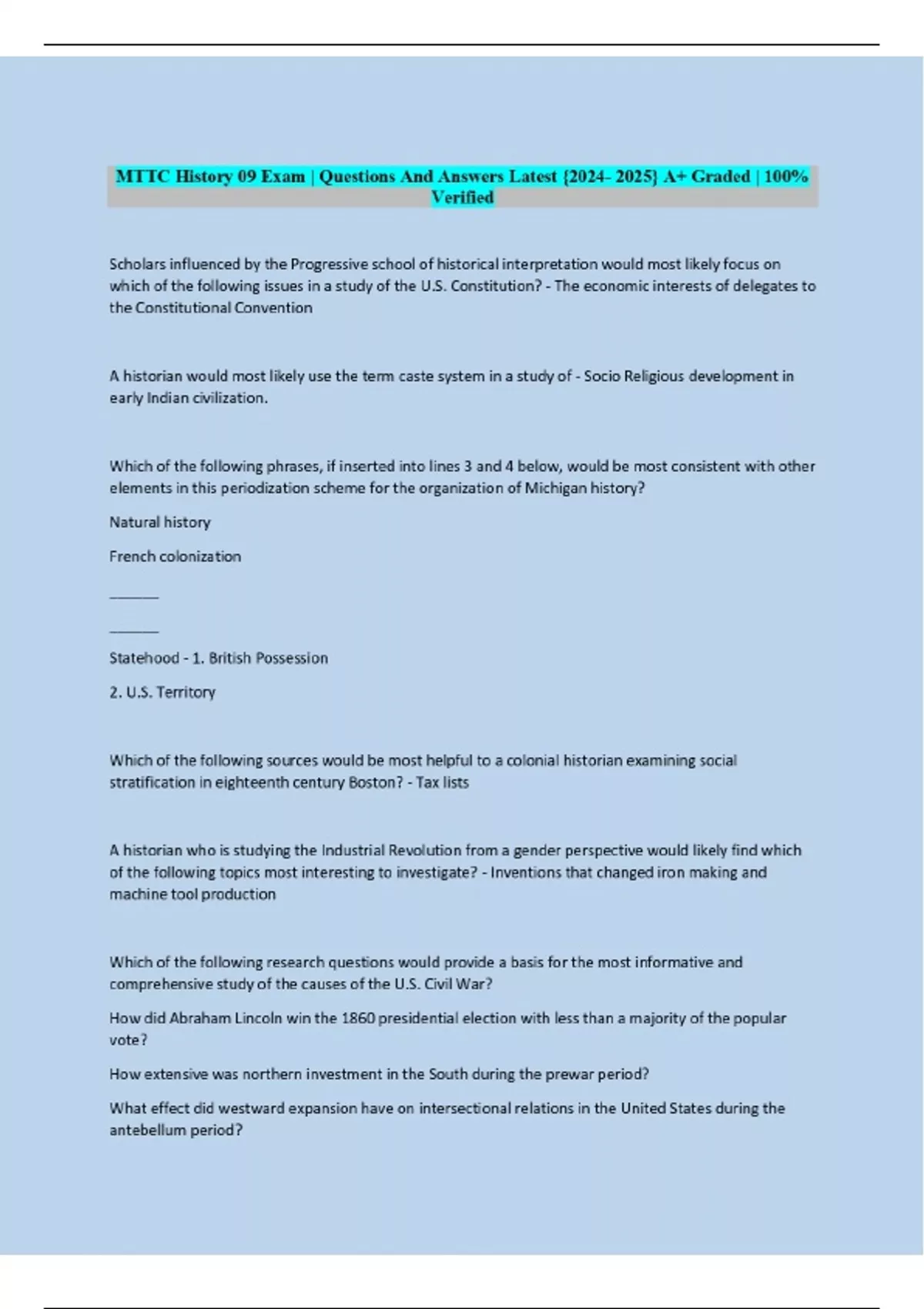 mttc history 09 exam questions and answers