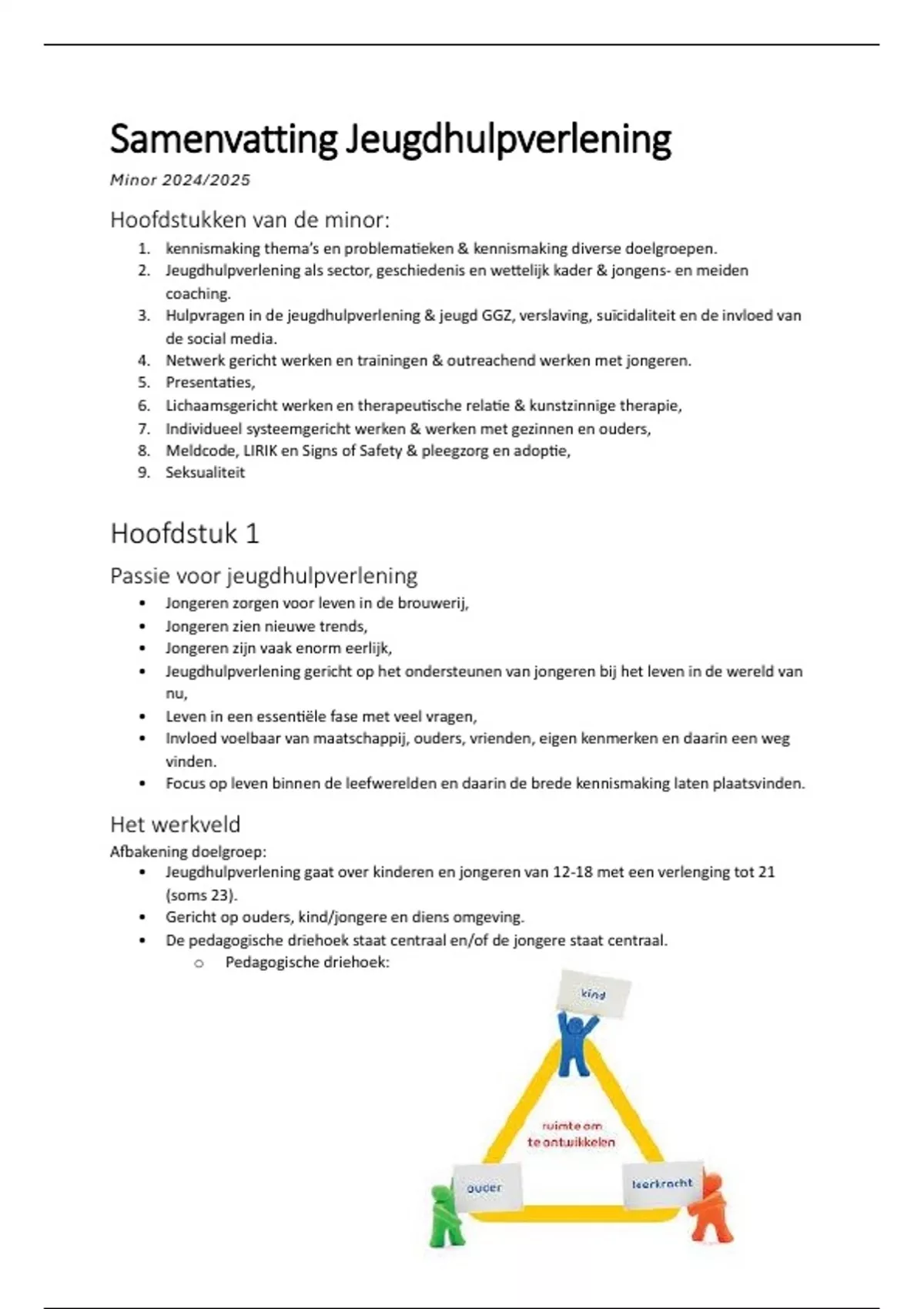Samenvatting - Minor Jeughulpverlening Deze samenvatting is gemaakt door de stof vanuit de hoorcolleges, powerpoints en docent bij elkaar te voegen. De verschillende hoorcolleges zijn opgenomen en de extra informatie is uitgetypt per hoofdstuk. Deze samenvatting is vooral bedoelt voor studenten die de opleiding Toegepaste Psychologie (evenuteel op HBO Academy) volgen. De tekst is op dat tentamen berust.