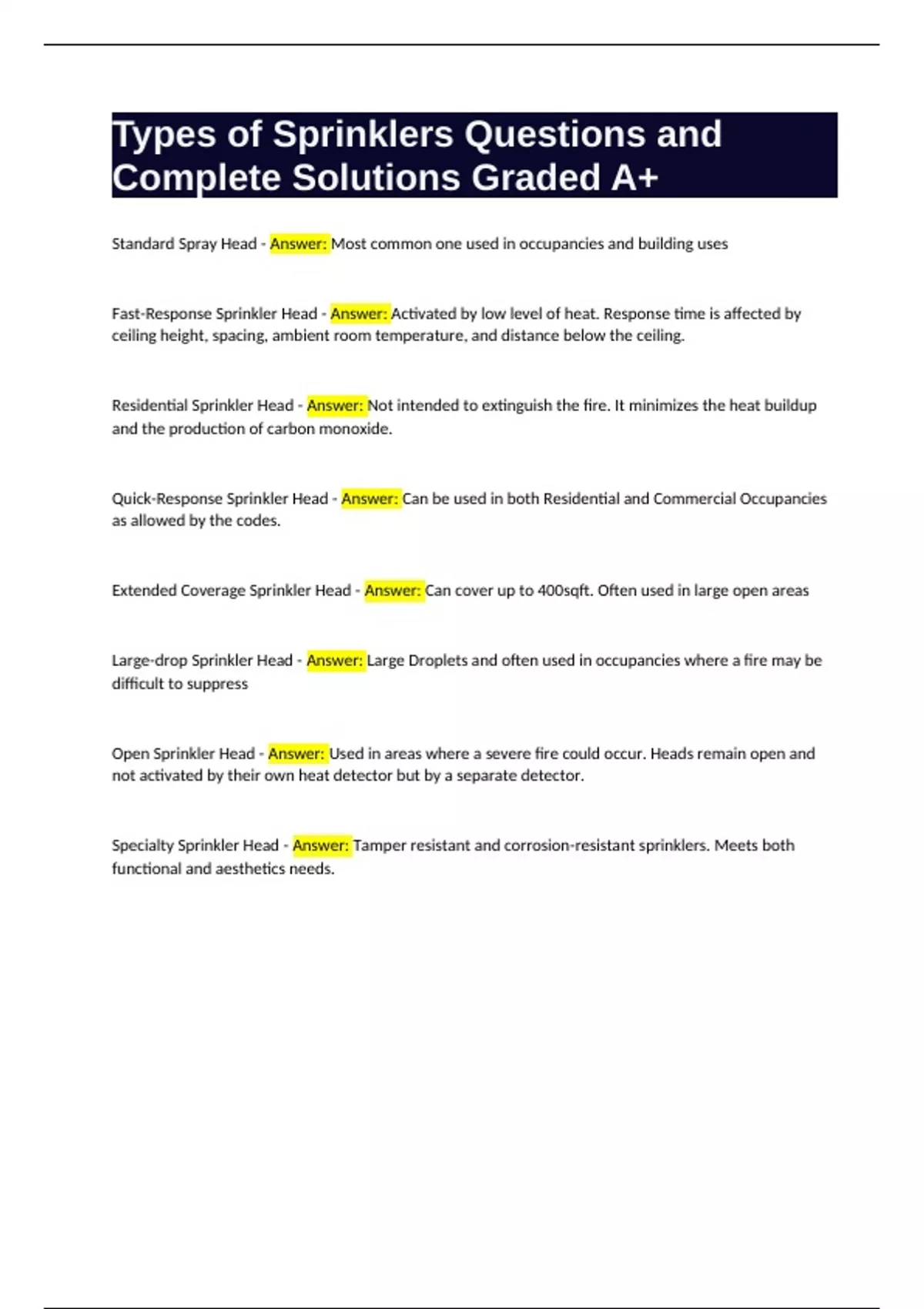 Types of Sprinklers Questions and Complete Solutions Graded A+