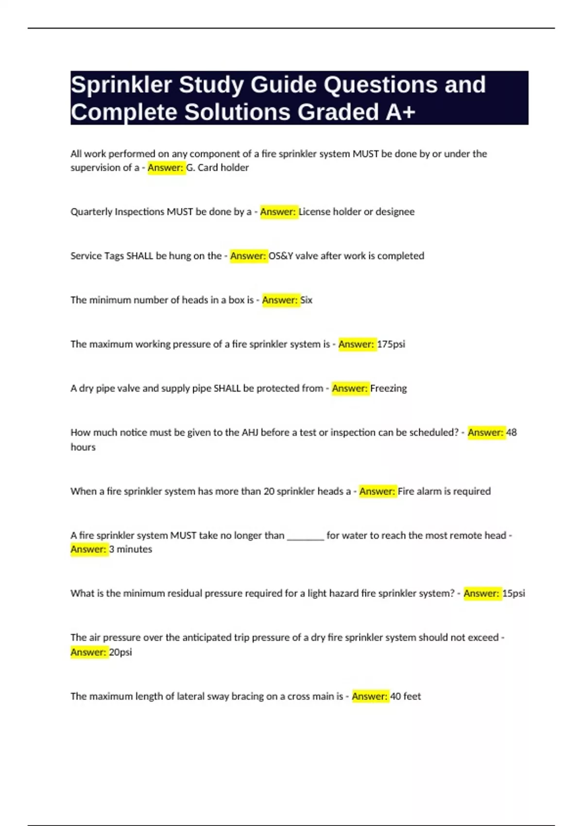 Sprinkler Study Guide Questions and Complete Solutions Graded A+