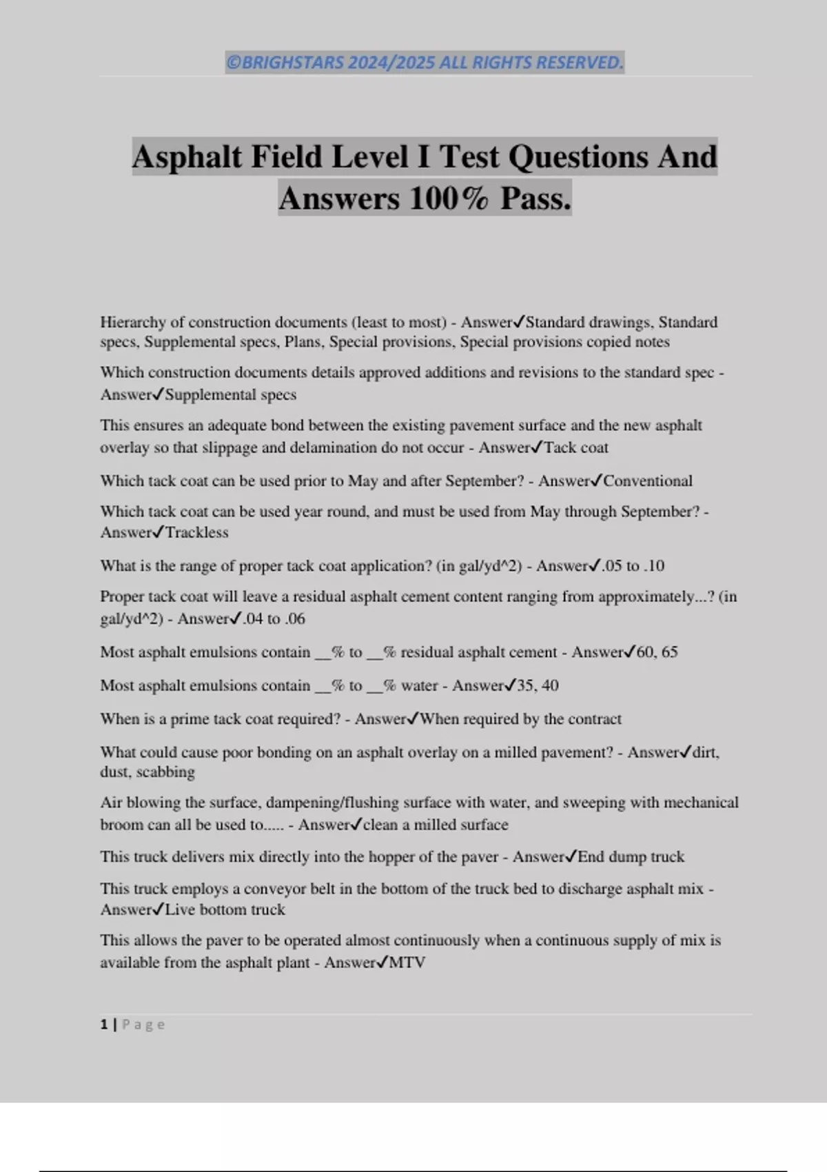Asphalt Field Level I Test Questions And Answers 100% Pass. Hierarchy of construction documents (least to most) - AnswerStandard drawings, Standard specs, Supplemental specs, Plans, Special provisions, Special provisions copied notes Which construction documents details approved additions and revisions to the standard spec - AnswerSupplemental specs This ensures an adequate bond between the existing pavement surface and the new asphalt overlay so that slippage and delamination do not occur - AnswerTack coat Which tack coat can be used prior to May and after September? - AnswerConventional Which tack coat can be used year round, and must be used from May through September? - AnswerTrackless What is the range of proper tack coat application? (in gal/yd^2) - Answer.05 to .10 Proper tack coat will leave a residual asphalt cement content ranging from approximately...? (in gal/yd^2) - Answer.04 to .06 Most asphalt emulsions contain __% to __% residual asphalt cement - Answer60, 65 Most asphalt emulsions contain __% to __% water - Answer35, 40 When is a prime tack coat required? - AnswerWhen required by the contract What could cause poor bonding on an asphalt overlay on a milled pavement? - Answerdirt, dust, scabbing Air blowing the surface, dampening/flushing surface with water, and sweeping with mechanical broom can all be used to..... - Answerclean a milled surface This truck delivers mix direc