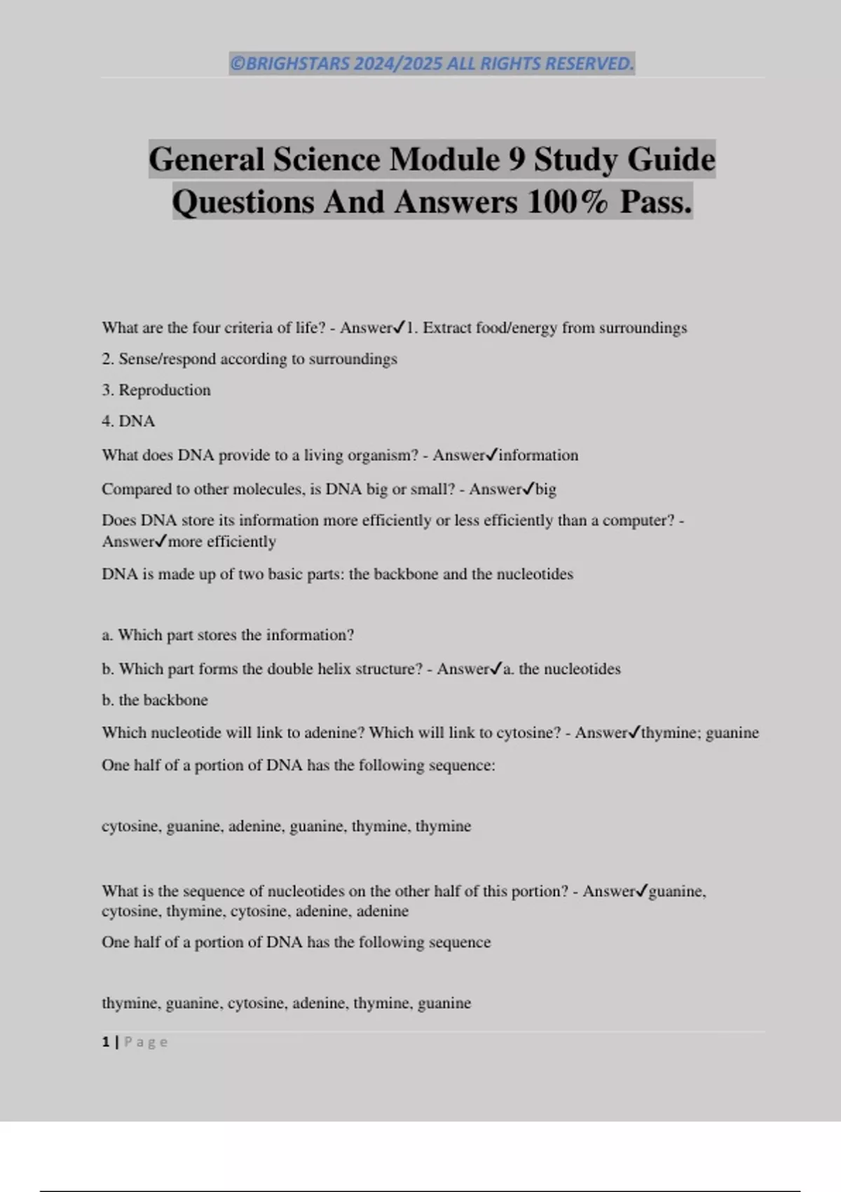 General Science Module 9 Study Guide Questions And Answers 100% Pass. What are the four criteria of life? - Answer1. Extract food/energy from surroundings 2. Sense/respond according to surroundings 3. Reproduction 4. DNA What does DNA provide to a living organism? - Answerinformation Compared to other molecules, is DNA big or small? - Answerbig Does DNA store its information more efficiently or less efficiently than a computer? - Answermore efficiently DNA is made up of two basic parts: the backbone and the nucleotides a. Which part stores the information? b. Which part forms the double helix structure? - Answera. the nucleotides b. the backbone Which nucleotide will link to adenine? Wh