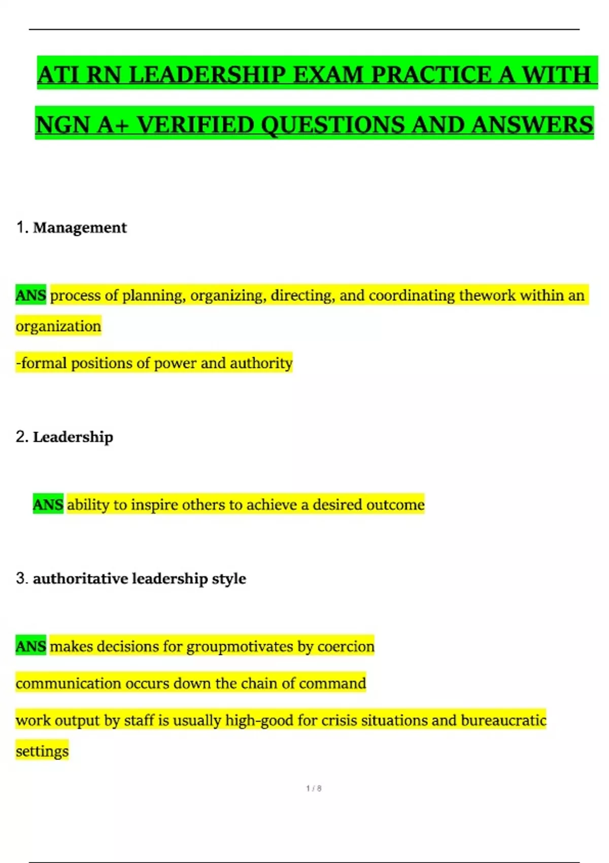 ATI RN LEADERSHIP EXAM PRACTICE A WITH A+ VERIFIED QUESTIONS AND ANSWERS ( V3 )