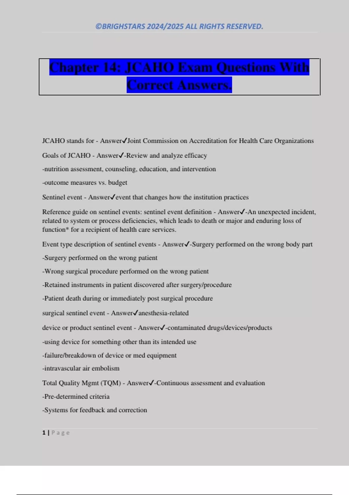 Chapter 14: JCAHO Exam Questions With Correct Answers. JCAHO stands for - AnswerJoint Commission on Accreditation for Health Care Organizations Goals of JCAHO - Answer-Review and analyze efficacy -nutrition assessment, counseling, education, and intervention -outcome measures vs. budget Sentinel event - Answerevent that changes how the institution practices Reference guide on sentinel events: sentinel event definition - Answer-An unexpected incident, related to system or process deficiencies, which leads to death or major and enduring loss of function* for a recipient of health care services. Event type description of sentinel events - Answer-Surgery performed on the wrong body part -Surgery performed on the wrong patient -Wrong surgical procedure performed on the wrong patient -Retained instruments in patient discovered after surgery/procedure -Patient death during or immediately post surgical procedure surgical sentinel event - Answeranesthesia-related device or product sentinel event - Answer-contaminated drugs/devices/products -using device for something other than its intended use -failure/breakdown of device or med equipment -intravascular air embolism Total Quality Mgmt (TQM) - Answer-Continuous assessment and evaluation -Pre-determined criteria -Systems for feedback and correc