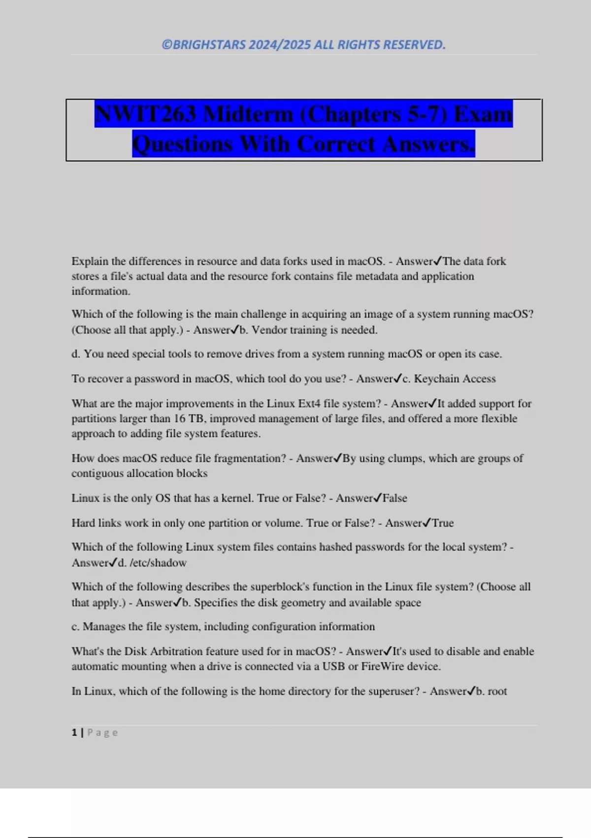 NWIT263 Midterm (Chapters 5-7) Exam Questions With Correct Answers. Explain the differences in resource and data forks used in macOS. - AnswerThe data fork stores a file's actual data and the resource fork contains file metadata and application information. Which of the following is the main challenge in acquiring an image of a system running macOS? (Choose all that apply.) - Answerb. Vendor training is needed. d. You need special tools to remove drives from a system running macOS or open its case. To recover a password in macOS, which tool do you use? - Answerc. Keychain Access What are the major improvements in the Linux Ext4 file system? - AnswerIt added support for partitions larger than 16 TB, improved management of large files, and offered a more flexible approach to adding file system features. How does macOS reduce file fragmentation? - AnswerBy using clumps, which are groups of contiguous allocation blocks Linux is the only OS that has a kernel. True or False? - AnswerFalse Hard links work in only one partition or volume. True or False? - AnswerTrue Which of the following Linux system files contains hashed passwords for the local system? - Answerd. /etc/shadow Which of the following describes the superblock's function in the Linux file system? (Choose all that apply.) - Answerb. Specifies the disk geometry and available space c. Manages the file system, including configuration information What's the Disk Arbitration feature used for in macOS? - AnswerIt's used to disable and enable automatic mounting when a drive is connected via a USB or FireWire device. In Linux, which of the following is the hom