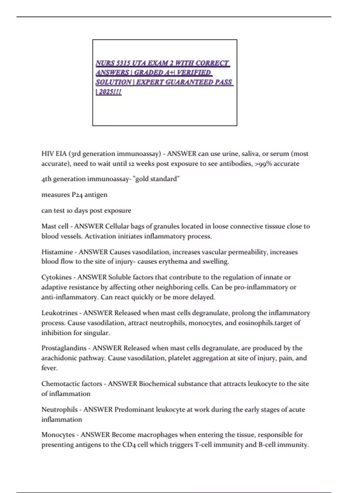 NURS 5315 UTA EXAM 2 WITH CORRECT ANSWERS | GRADED A+| VERIFIED SOLUTION | EXPERT GUARANTEED PASS | 2025!!! HIV EIA (3rd generation immunoassay) - ANSWER can use urine, saliva, or serum (most accurate), need to wait until 12 weeks post exposure to see antibodies, >99% accurate 4th generation immunoassay- "gold standard" measures P24 antigen can test 10 days post exposure Mast cell - ANSWER Cellular bags of granules located in loose connective tisssue close to blood vessels. Activation initiates inflammatory process. Histamine - ANSWER Causes vasodilation, increases vascular permeability, increases blood flow to the site of injury- causes erythema and swelling. Cytokines - ANSWER Soluble factors that contribute to the regulation of innate or adaptive resistance by affecting other neighboring cells. Can be pro-inflammatory or anti-inflammatory. Can react quickly or be more delayed. Leukotrines - ANSWER Released when mast cells degranulate, prolong the inflammatory process. Cause vasodilation, attract neutrophils, monocytes, and t of inhibition for singular. Prostaglandins - ANSWER Released when mast cells degranulate, are produced by the arachidonic pathway. Cause vasodilation, platelet aggregation at site of injury, pain, and fever. Chemotactic factors - ANSWER Biochemical substance that attracts leukocyte to the site of inflammation Neutrophils - ANSWER Predominant leukocyte at work during the early stages of acute inflammation Monocytes - ANSWER Become macrophages when entering the tissue, responsible for presenting antigens to the CD4 cell which triggers T-cell immunity and B-cell immunity.