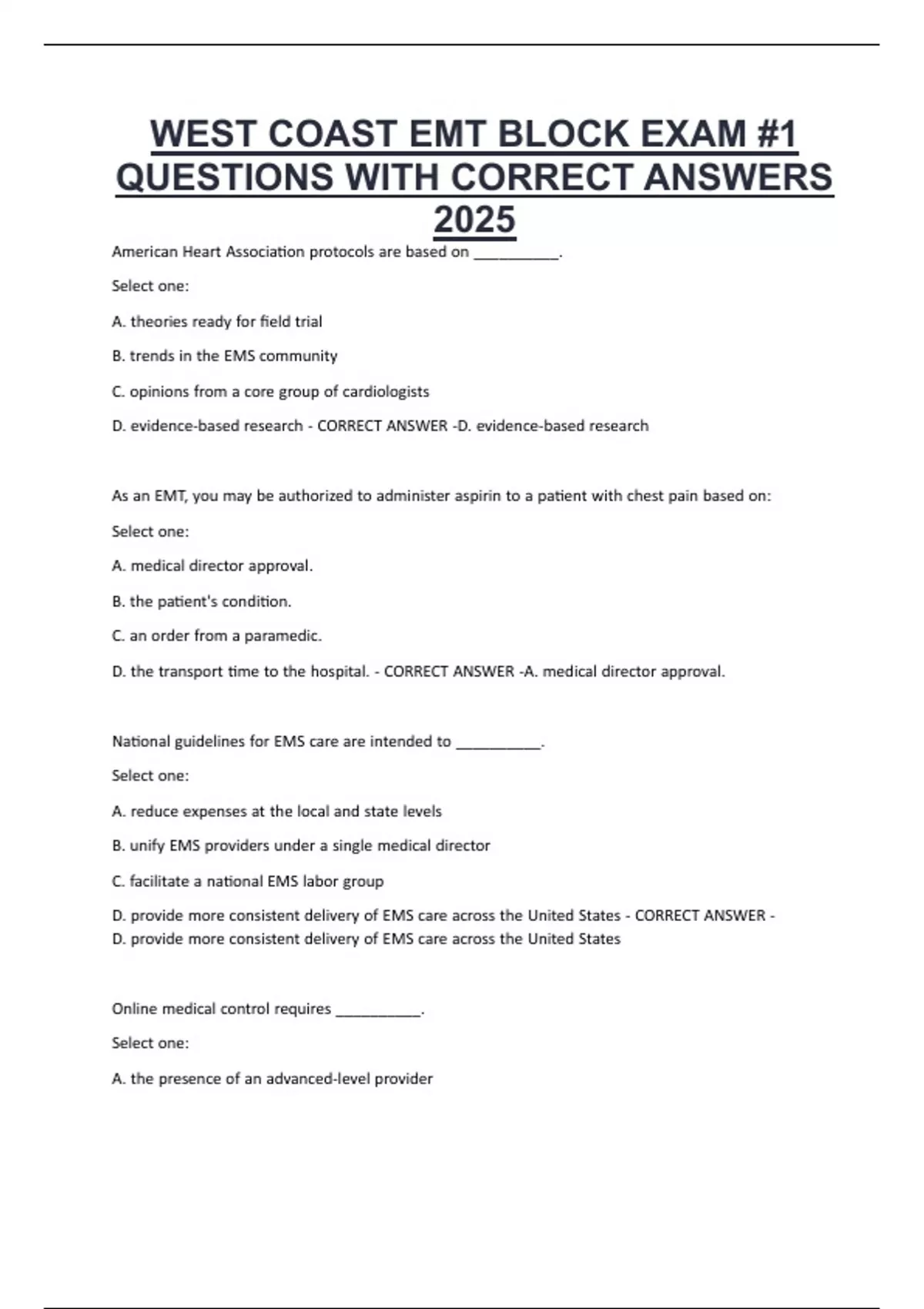 WEST COAST EMT BLOCK EXAM #1