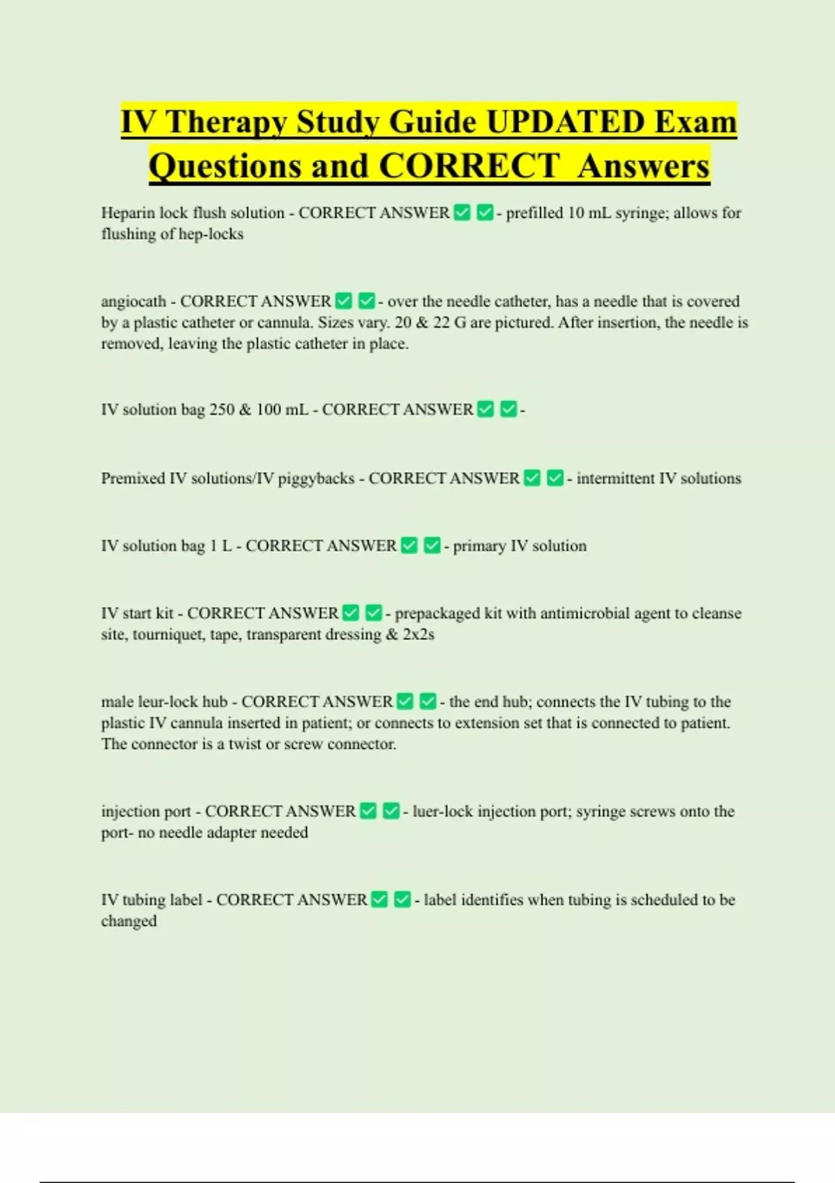IV Therapy Study Guide UPDATED Exam Questions and CORRECT Answers Heparin lock flush solution - CORRECT ANSWER - prefilled 10 mL syringe; allows for flushing of hep-locks angiocath - CORRECT ANSWER - over the needle catheter, has a needle that is covered by a plastic catheter or cannula. Sizes vary. 20 & 22 G are pictured. After insertion, the needle is removed, leaving the plastic catheter in place