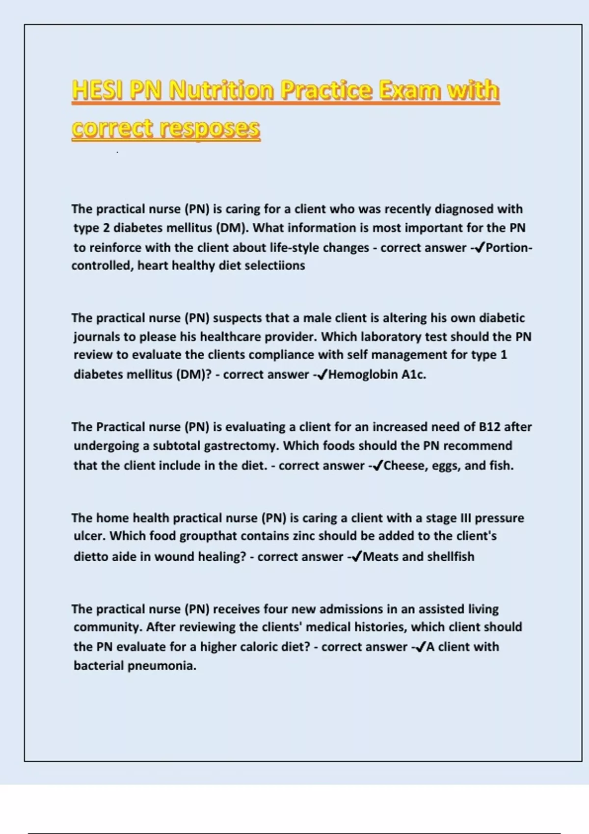 HESI PN Nutrition Practice Exam with correct responses