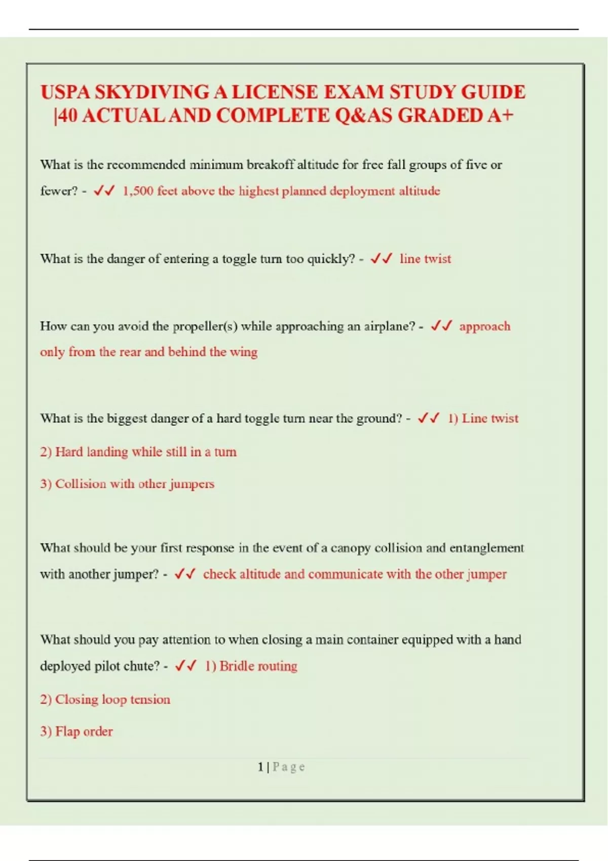 USPA SKYDIVING A LICENSE EXAM STUDY GUIDE 2025 |40 ACTUAL AND COMPLETE Q&AS GRADED A+