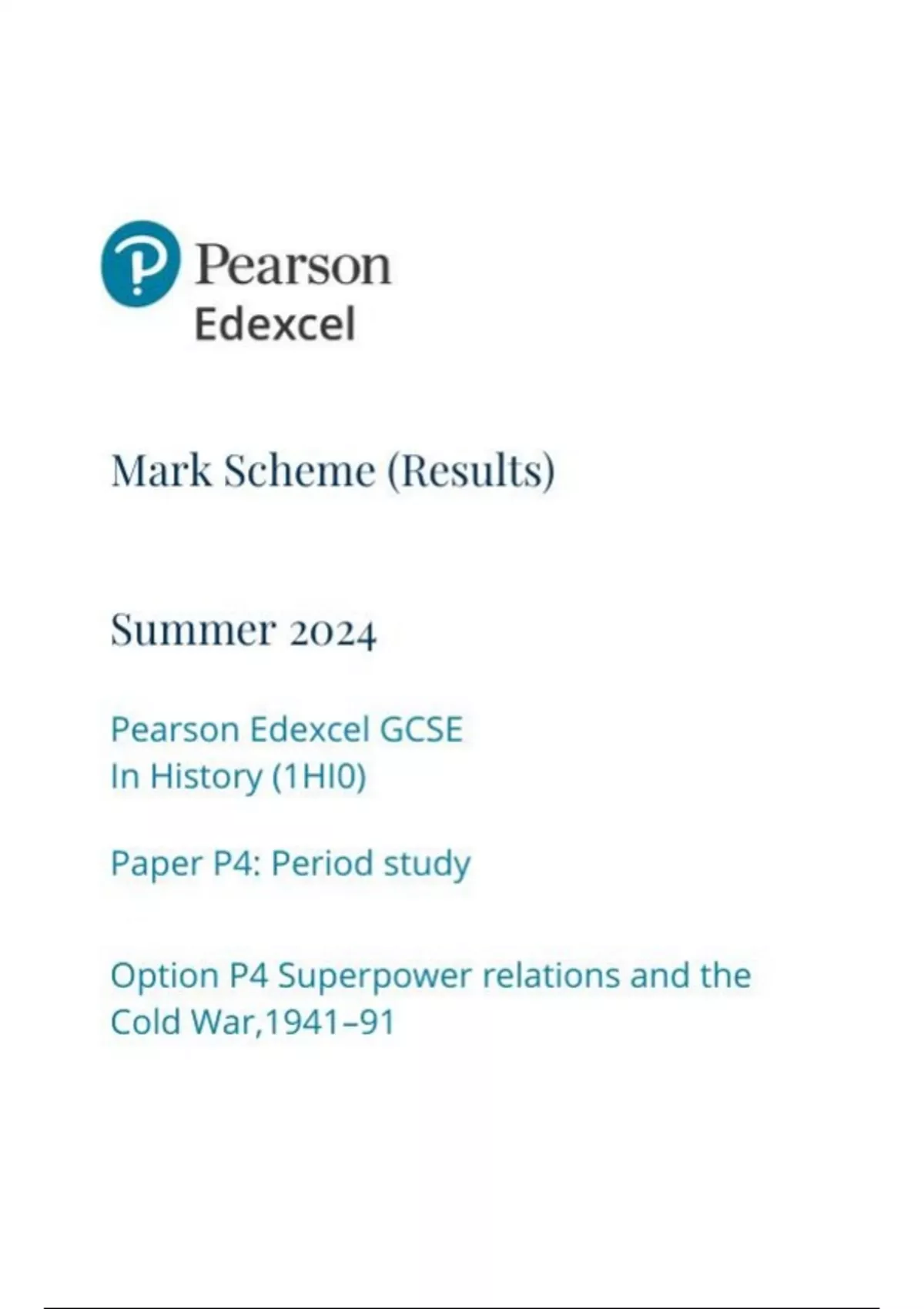 Pearson Edexcel GCSE In History 1hi0-p4 (1HI0) Paper P4: Period study Option P4 Superpower relations and the Cold War,1941–91 mark scheme june 2024
