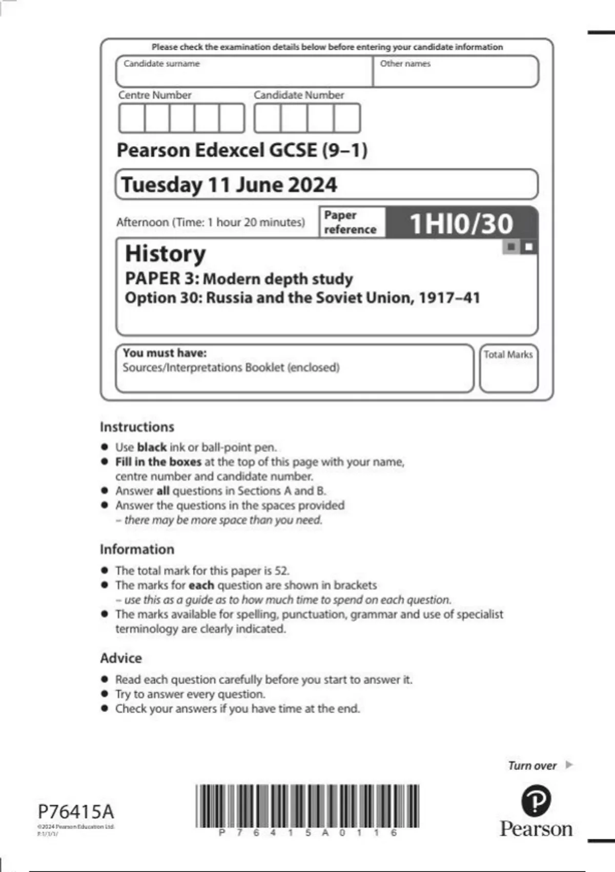 Pearson Edexcel GCSE (9–1) History PAPER 3: 1hi0-30 Modern depth study Option 30: Russia and the Soviet Union, 1917–41 question paper june 2024