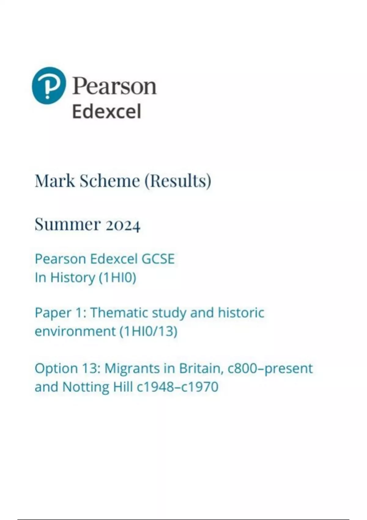 Pearson Edexcel GCSE In History (1HI0) Paper 1: Thematic study and historic environment (1HI0/13) Option 13: Migrants in Britain, c800–present and Notting Hill c1948–c1970 mark scheme june 2024