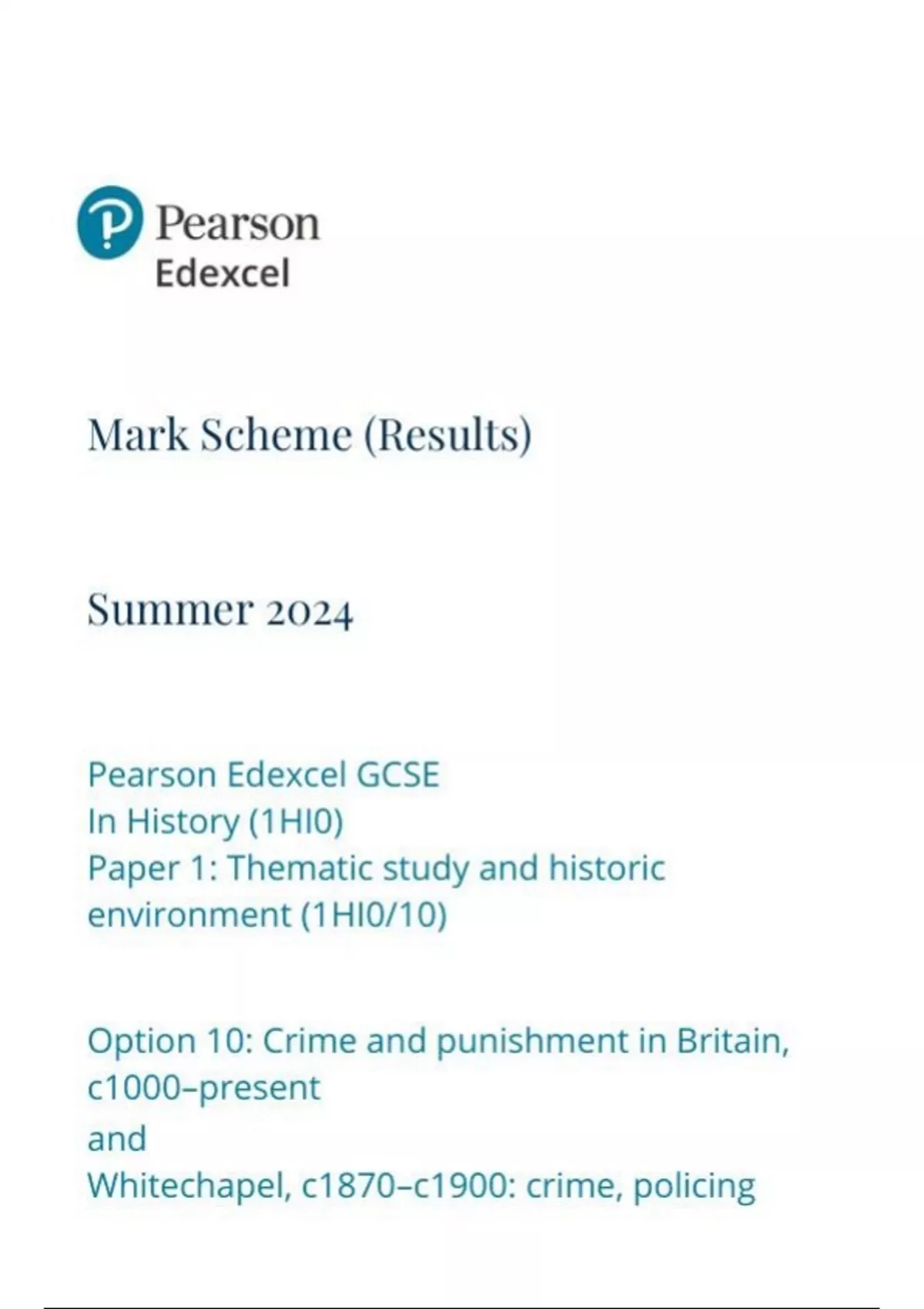 Pearson Edexcel GCSE In History (1HI0) Paper 1: Thematic study and historic environment (1HI0/10) Option 10: Crime and punishment in Britain, c1000–present and Whitechapel, c1870–c1900: crime, policing mark scheme june 2024