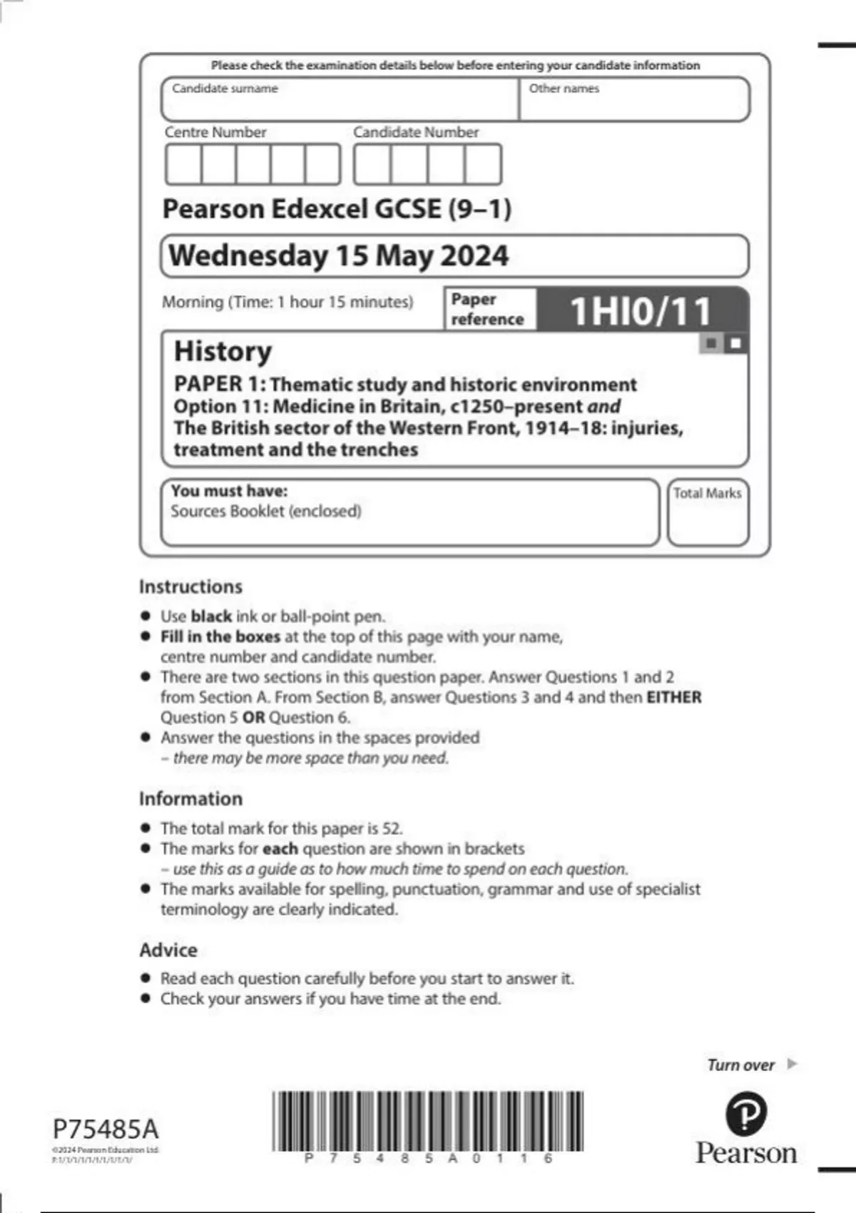 Pearson Edexcel GCSE (9–1) History PAPER 1: 1hi0-11 Thematic study and historic environment Option 11: Medicine in Britain, c1250–present and The British sector of the Western Front, 1914–18: injuries, treatment and the trenches question paper june 2024