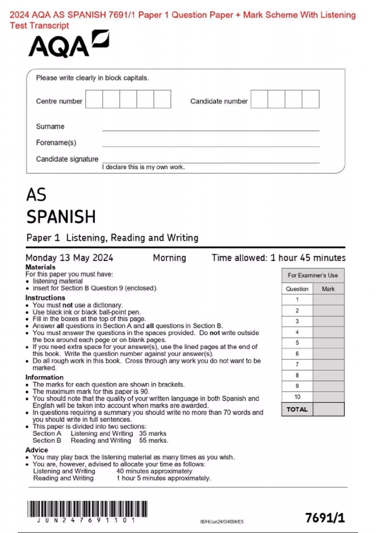 2024 AQA AS SPANISH 7691/1 Paper 1 Question Paper + Mark Scheme With Listening Test Transcript