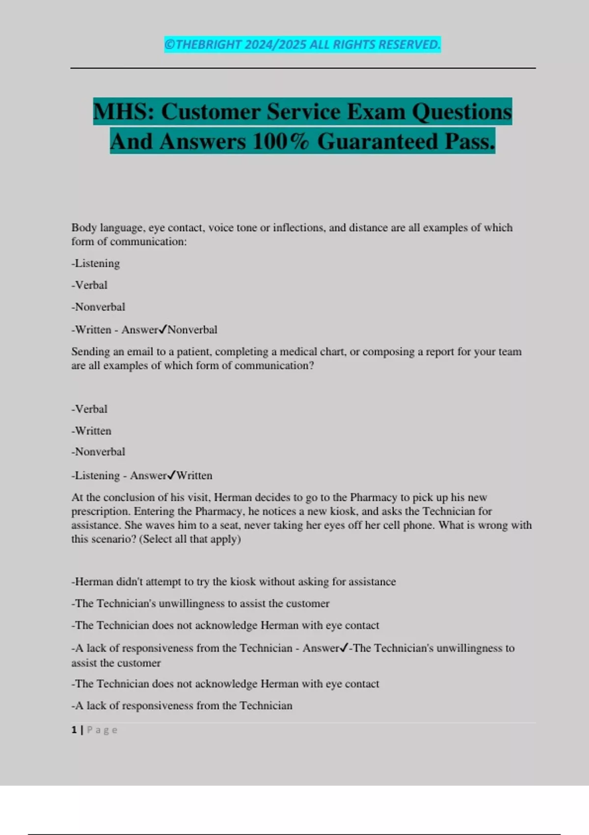 MHS: Customer Service Exam Questions And Answers 100% Guaranteed Pass. Body language, eye contact, voice tone or inflections, and distance are all examples of which form of communication: -Listening -Verbal -Nonverbal -Written - AnswerNonverbal Sending an email to a patient, completing a medical chart, or composing a report for your team are all examples of which form of communication? -Verbal -Written -Nonverbal -Listening - AnswerWritten At the conclusion of his visit, Herman decides to go to the Pharmacy to pick up his new prescription. Entering the Pharmacy, he notices a new kiosk, and asks the Technician for assistance. She waves him to a seat, never taking her eyes off her cell phone. What is wrong with this scenario? (Select all that apply) -Herman didn't attempt to try the kiosk without asking for assistance -The Technician's unwillingness to assist the customer -The Technician does not acknowledge Herman with eye contact -A lack of responsiveness from the Technician - Answer-The Technician's unwillingness to assist the customer -The Technician does not acknowledge Herman with eye contact -A lack of responsiveness from t