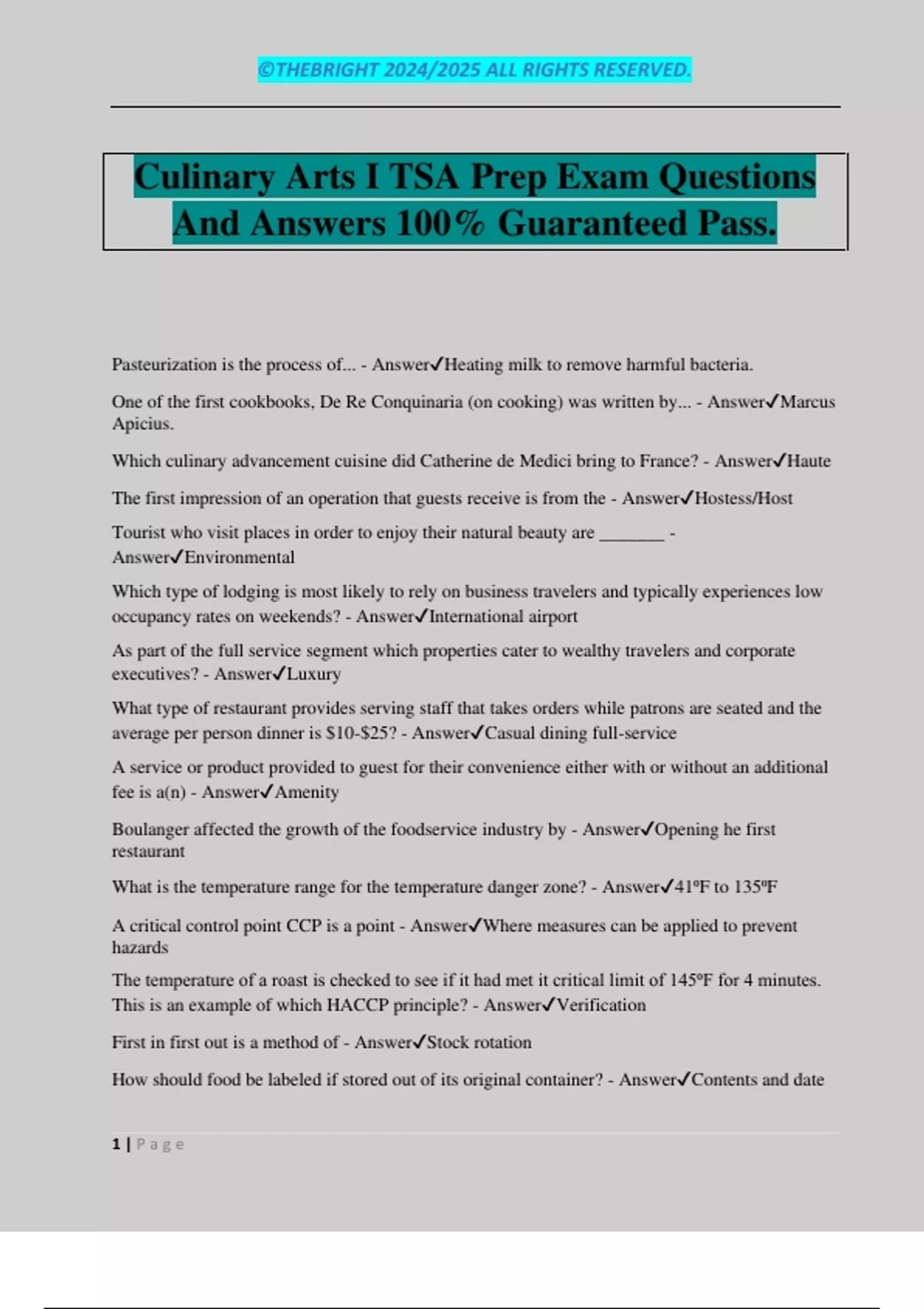 Culinary Arts I TSA Prep Exam Questions