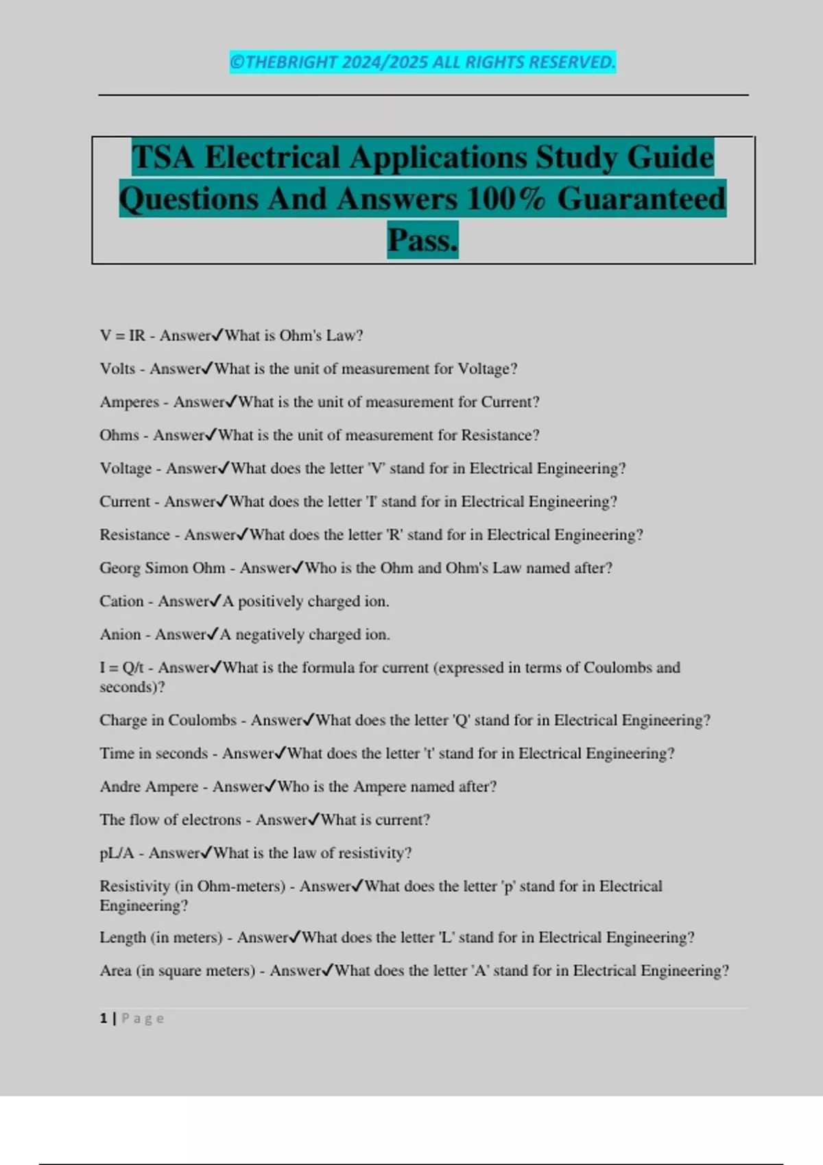 Ohms - Answer✔What is the unit of measurement for Resistance?