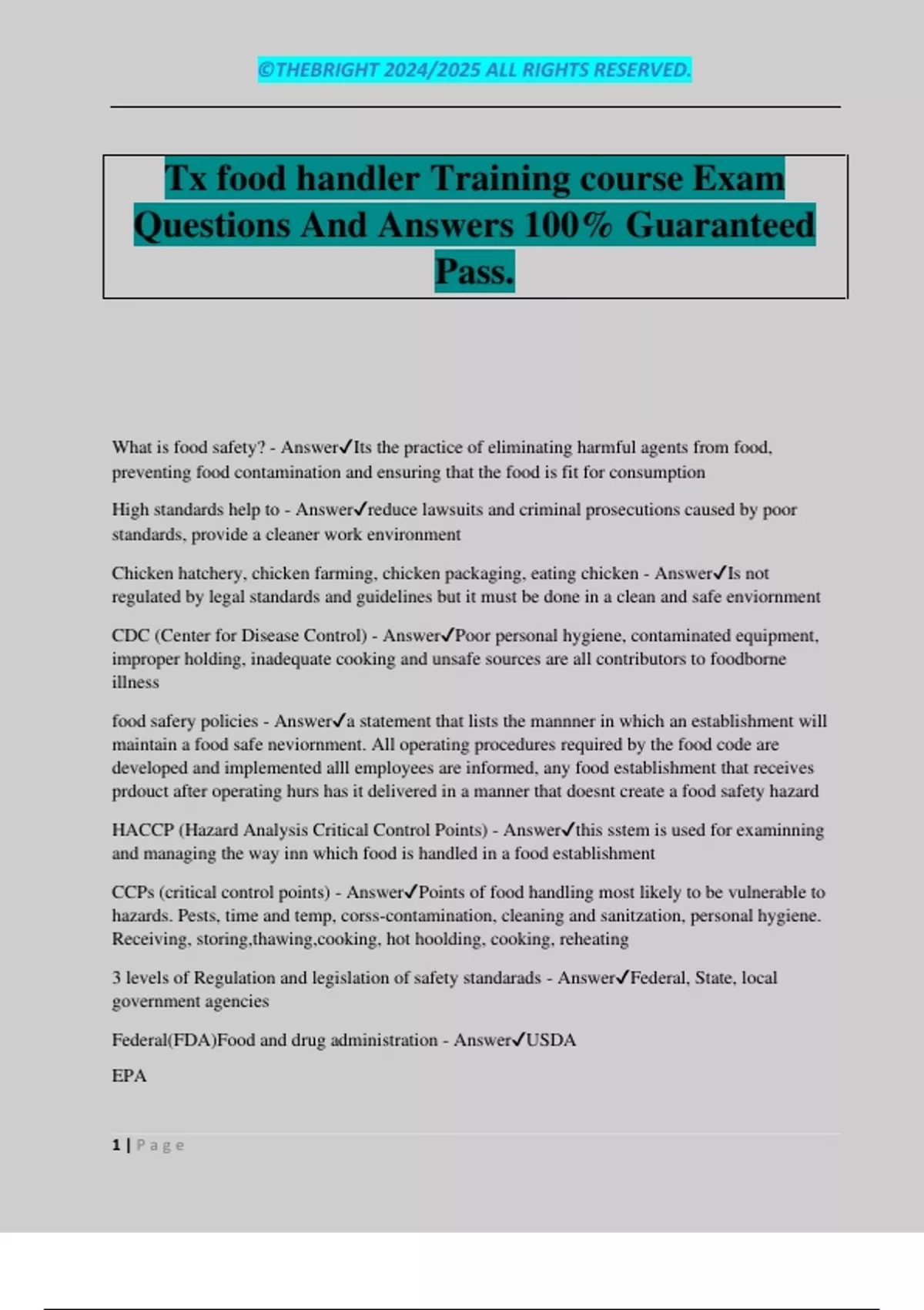 Tx food handler Training course Exam Questions And Answers 100% Guaranteed Pass. What is food safety? - AnswerIts the practice of eliminating harmful agents from food, preventing food contamination and ensuring that the food is fit for consumption High standards help to - Answerreduce lawsuits and criminal prosecutions caused by poor standards, provide a cleaner work environment Chicken hatchery, chicken farming, chicken packaging, eating chicken - AnswerIs not regulated by legal standards and guidelines but it must be done in a clean and safe enviornment CDC (Center for Disease Control) - AnswerPoor personal hygiene, contaminated equipment, improper holding, inadequate cooking and unsafe sources are all contributors to foodborne illness food safery policies - Answera statement that lists the mannner in which an establishment will maintain a food safe neviornment. All operating procedures required by the food code are developed and implemented alll employees are informed, any food establishment that receives prdouct after operating hurs has it delivered in a manner that doesnt create a food safety hazard HACCP (Hazard Analysis Critical Control Points) - Answerthis sstem is used for examinning and managing the way inn which food is handled in a food establishment CCPs (critical control points) - AnswerPoints of food handling most likely to be vulnerable to hazards. Pests, time and temp, corss-contamination, cleaning and sanitzation, personal hygiene. Receiving, storing,thawing,cooking, hot hoolding, cooking, reheating 3 levels of Regulation and legislation of safety standarads - AnswerFederal, State, local government agencies Federal(FDA)Food and dr