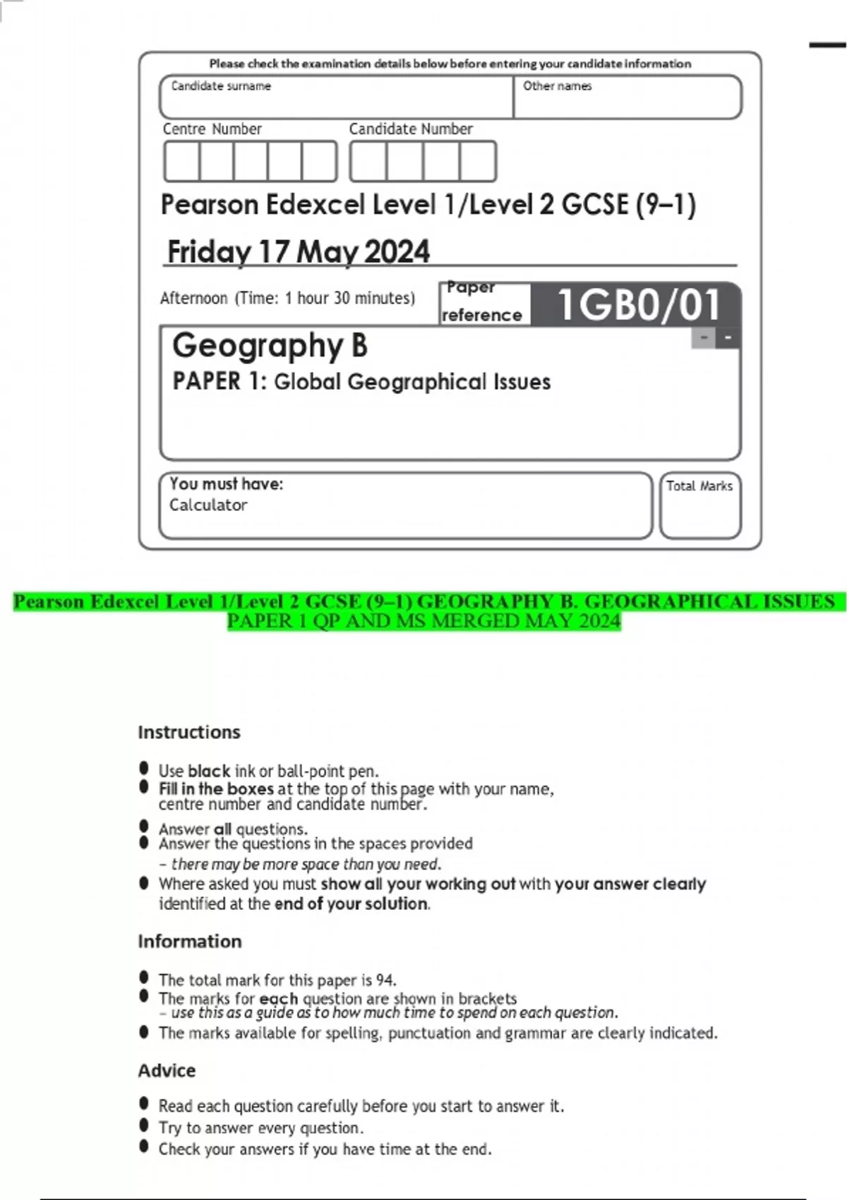 Pearson Edexcel Level 1/Level 2 GCSE (9–1) GEOGRAPHY B. GEOGRAPHICAL ISSUES PAPER 1 QP AND MS MERGED MAY 2024