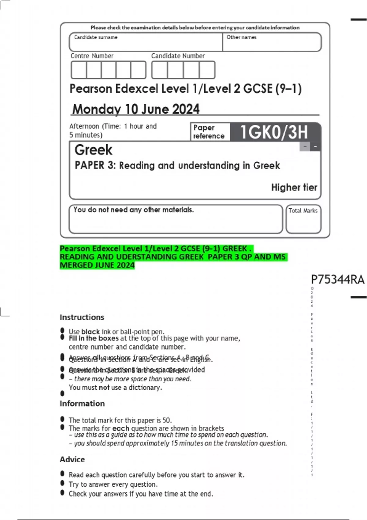 Pearson Edexcel Level 1/Level 2 GCSE (9–1) GREEK . READING AND UDERSTANDING GREEK PAPER 3 QP AND MS MERGED JUNE 2024